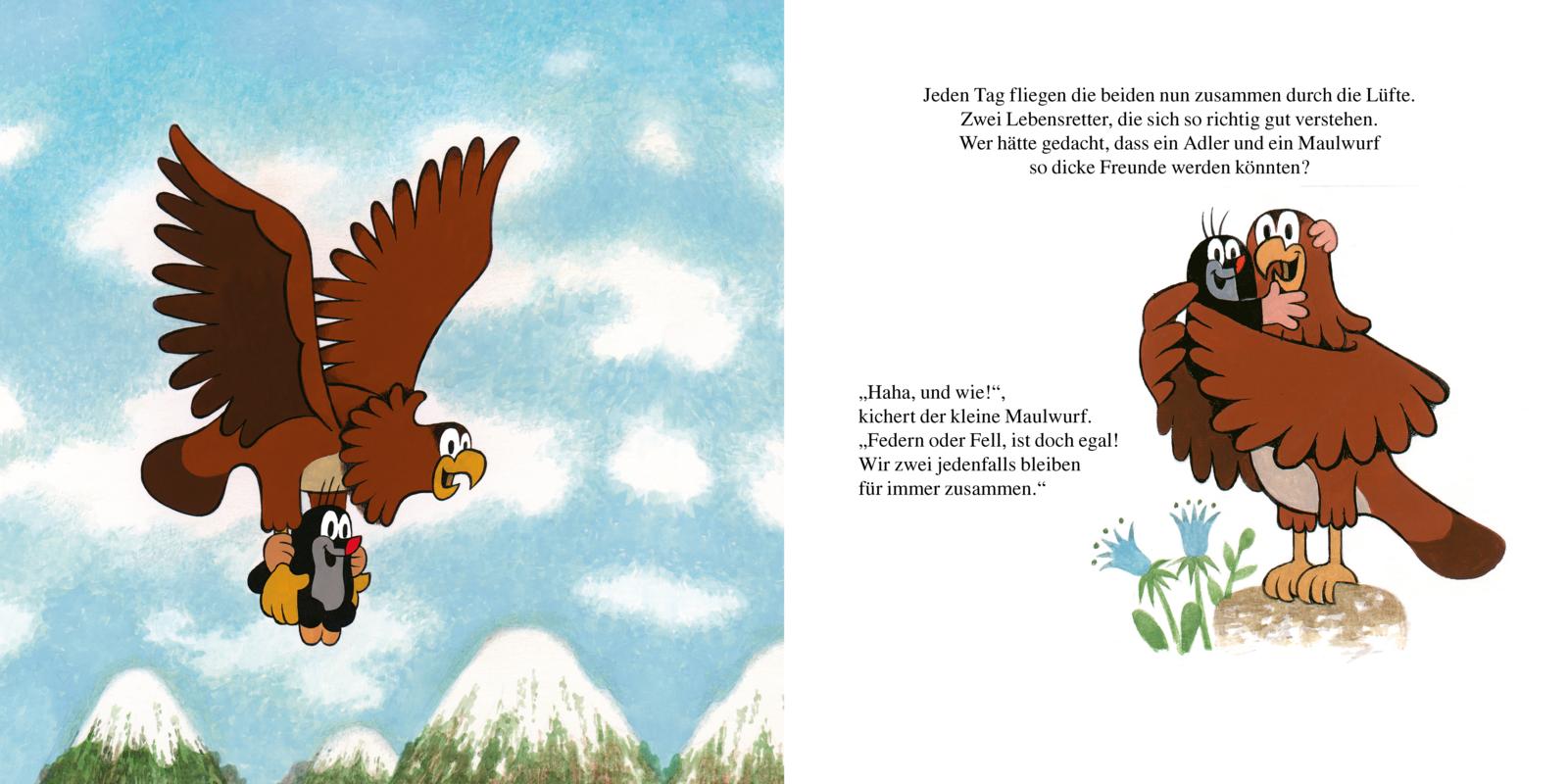 Da hat der kleine Maulwurf aber kräftig zu tun: Für ein hilfloses Adlerbaby wird er zum Zieh-Papa. Dabei kann er nur staunen, wie groß doch der Hunger des kleinen Vogels ist und wie groß dieser Vogel nach kürzester Zeit selbst wird. Ein ausgewachsener Adler sollte natürlich fliegen können - nur, wie soll ein Maulwurf einem Vogel das Fliegen beibringen? Und können zwei so unterschiedliche Tiere überhaupt Freunde bleiben? Als der Fuchs vorbeischaut, ist der Maulwurf über seinen starken Gefährten jedenfalls mehr als glücklich: Der kleine Maulwurf und der Adler sind eben ein richtig gutes Team.