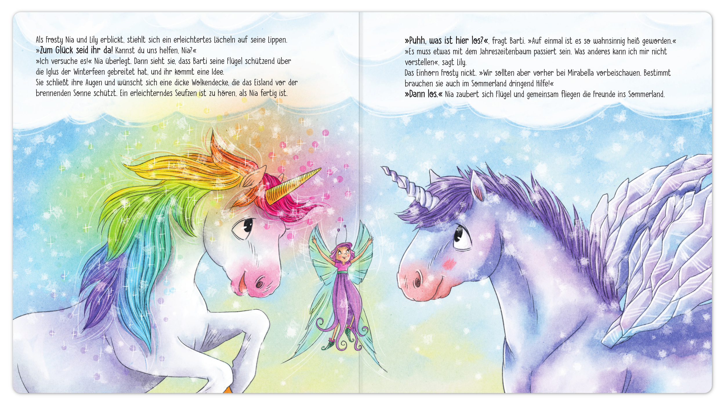 Einhorn Nia und Fee Lily erleben ein neues magisches Abenteuer! Im Einhorn-Land herrscht Chaos: goldene Blätter im Frühling, Hitze im Winter. Gemeinsam helfen sie ihren Freunden und zeigen, dass Zusammenhalt und Freundschaft auch schwierige Zeiten überwinden können. Mit echter Regenbogen-Mähne auf dem Cover – zum Streicheln und Kämmen. Ein liebevoll illustriertes Bilderbuch für Kinder ab 4 Jahren.