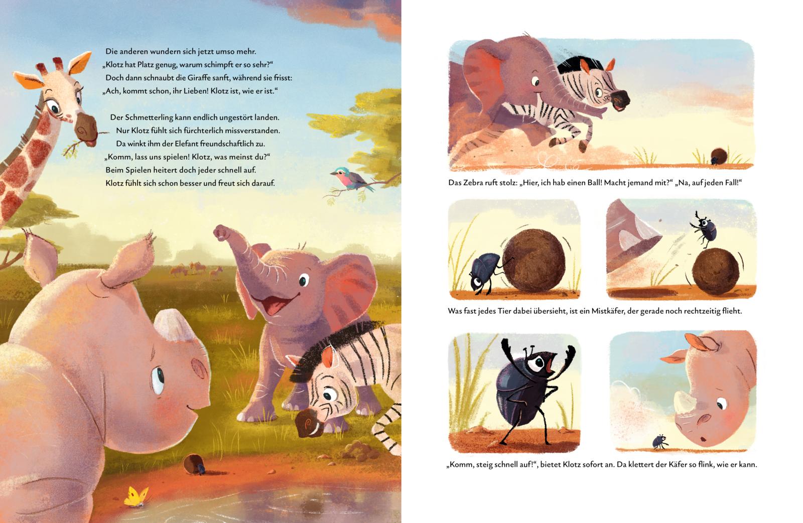 Während die großen Tiere der Savanne laut toben, liebt Klotz die Ruhe an seinem Lieblingsplatz. Dort lauscht er dem Summen der Insekten und genießt die bunten Farben der Regenzeit. Er ist eben ein besonderes Nashorn.