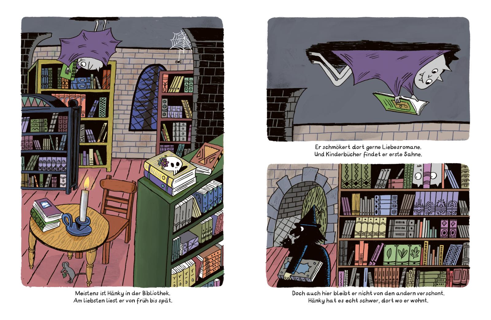 Hänky, der kleine Vampir, liebt Bücher und Tomaten! Gruselige Gestalten liebt er nicht. Denen möchte Hänky am liebsten gar nicht begegnen. Leider wohnt er mit gleich vier davon zusammen. Fürchterlich, schauerlich, unheimlich und schrecklich sind seine Mitbewohner*innen - glaubt Hänky. Jedenfalls so lange bis er sie kennenlernt. Normalerweise versteckt Hänky sich ja vor der Hexe, dem Skelett, dem Gespenst und der Drachendame. Aber als er sie eines Tages aus Versehen trifft, merkt er ganz schnell, dass diese Megamonsterbanausen vor allem eines sind: Total liebenswert!