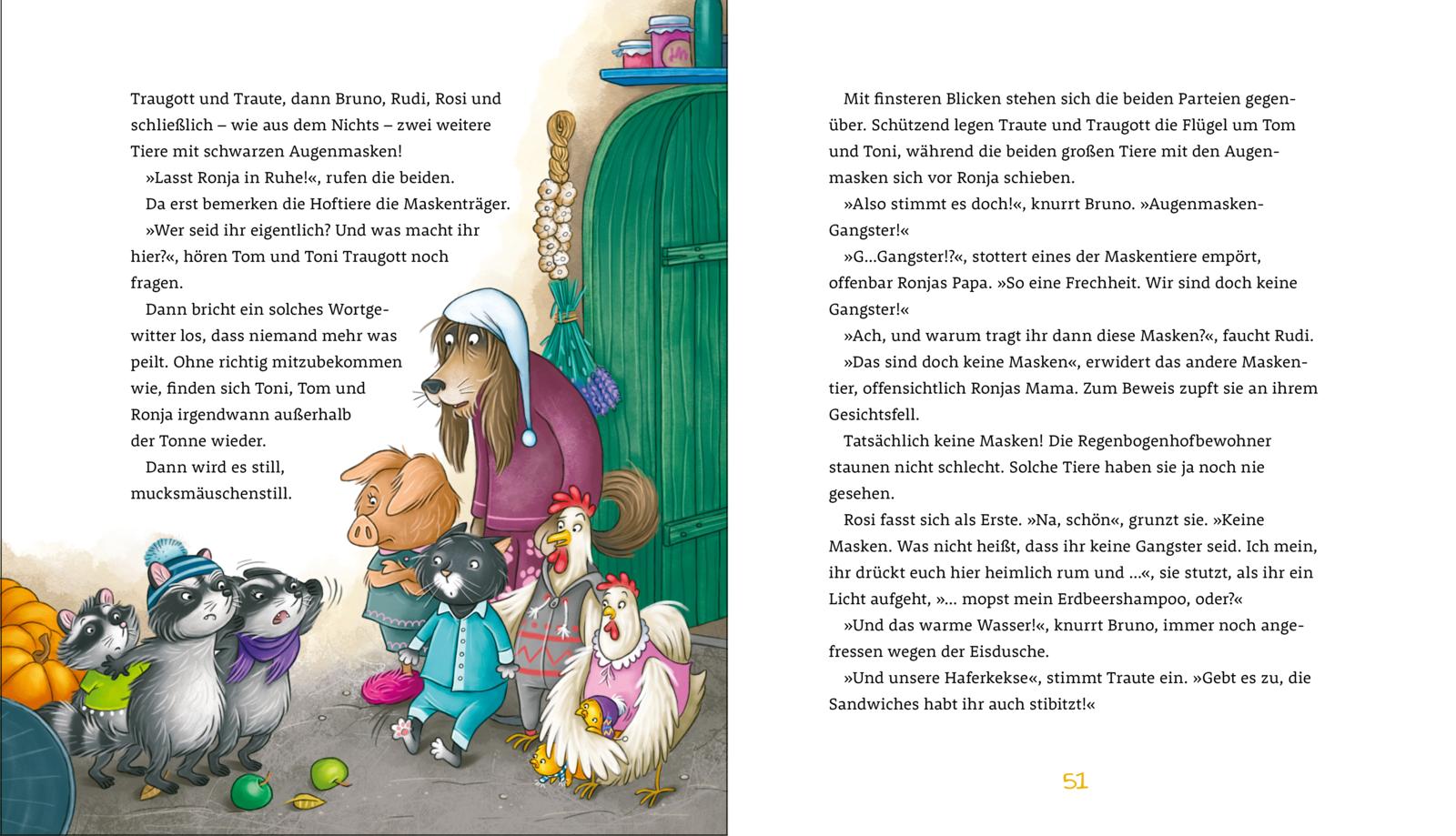 Also gründen die tierischen Regenbogenhofbewohner*innen kurzerhand eine waschbärenstarke Bande. Und mit vereinten Kräften, Witz und spektakulären Abschreck-Aktionen gelingt es ihnen, die Leute in die Flucht zu schlagen, die ihnen den Hof abluchsen wollen.