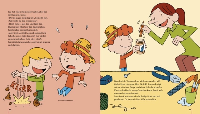 Renus Berbig’s Held Juri hat viele ausgezeichnete Ideen. Beim Reparatur-Tag entdeckt er sein Talent, Ausgedientem einen neuen Zweck verleihen. Ulf K. illustriert die Kita-Werkstatt in seinem klaren reduzierten Stil humorvoll und lebensnah.