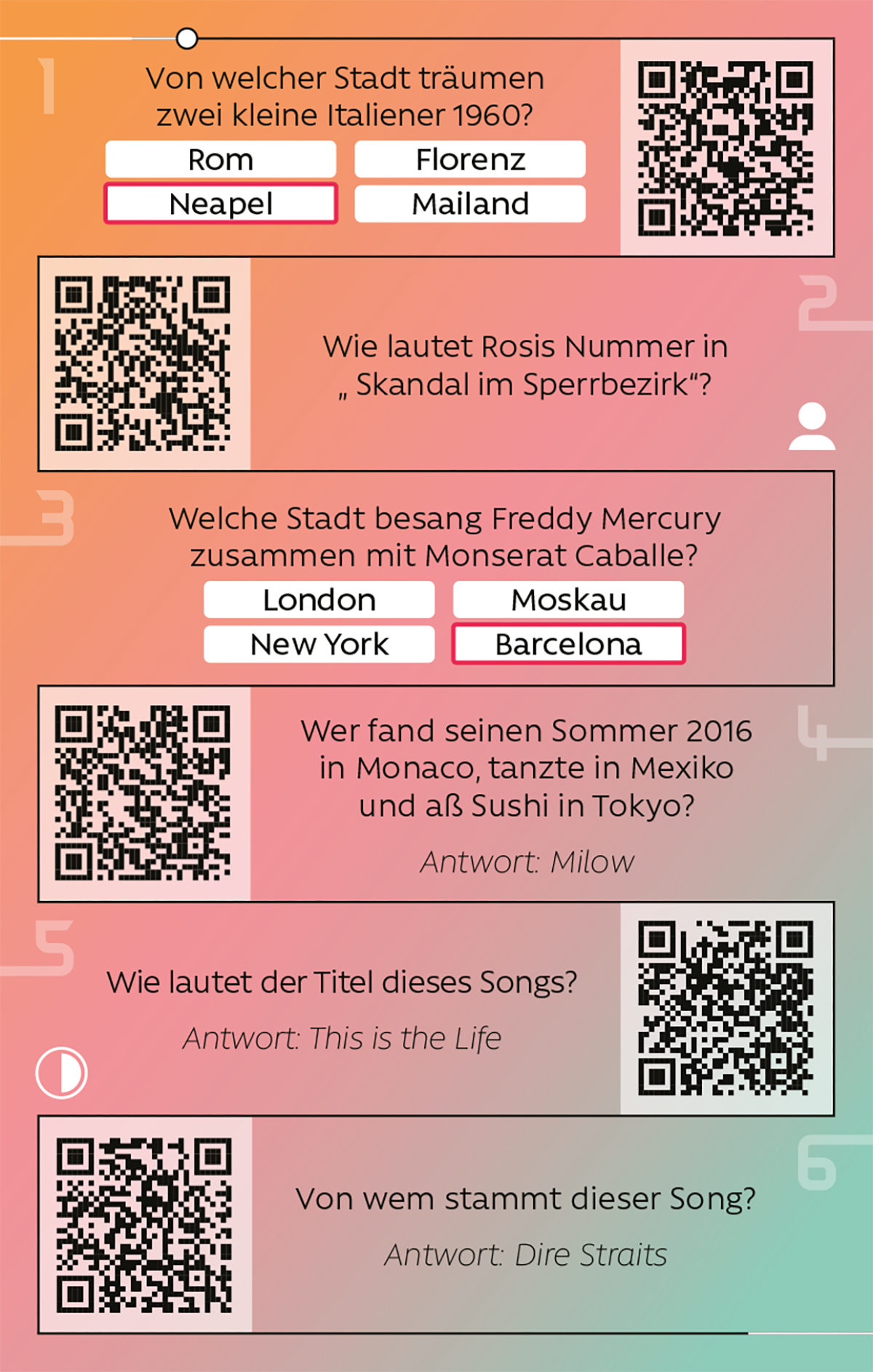Hinweis: Einige Fragen nutzen Spotify. Für das Spiel benötigt die Spielgruppe mindestens ein Smartgerät mit Internetzugang. Ein Spotify Premium Account ist nicht zwingend erforderlich, erleichtert aber das Spiel.
