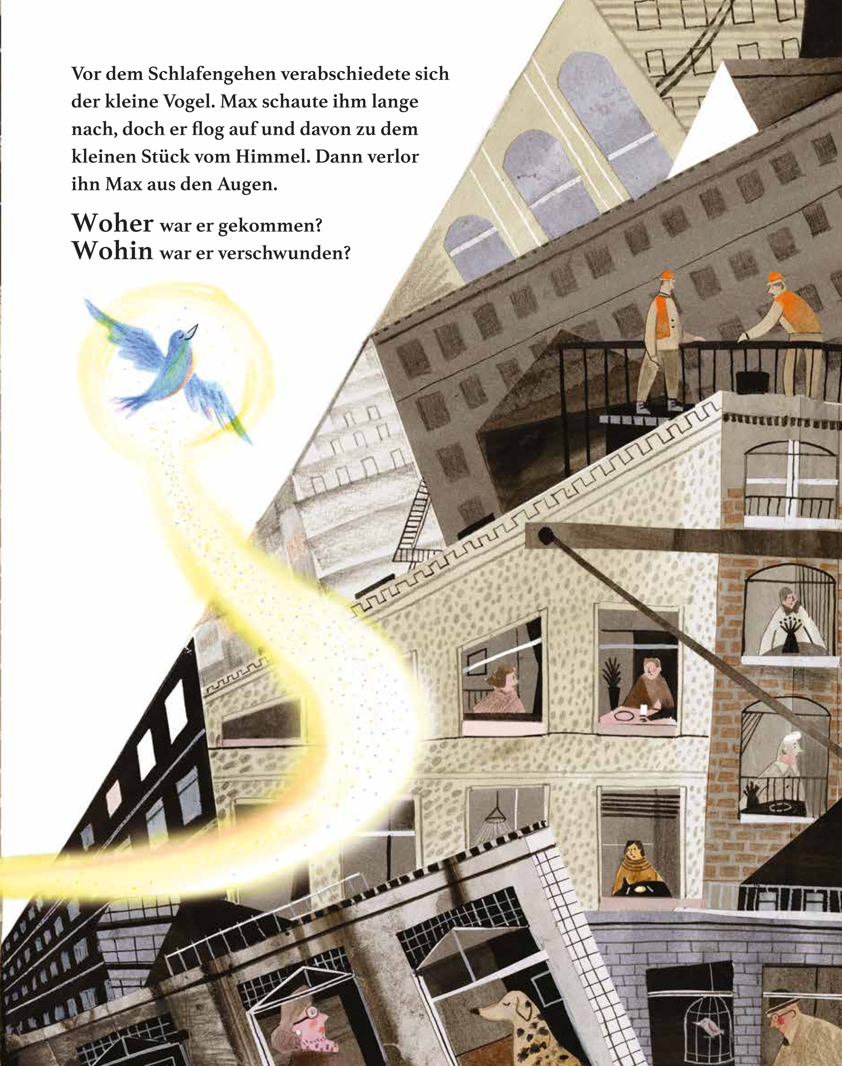 Max wohnt in einem hohen Gebäude in einer geschäftigen Stadt. Von seinem Fenster aus sieht er nur die belebte Straße, auf der Menschen hektisch hin und her eilen. Oben erkennt er nur einen kleinen Ausschnitt des Himmels, aber jeden Tag blickt er hinauf und fragt sich, was wohl jenseits des Blaus, zwischen den Wolken, zu finden ist.Dann, eines Tages, taucht ein Vogel auf und landet auf seinem Fenstersims. Der Vogel ist auf der Suche nach einem Freund. Aber nicht nach irgendeinem Freund - sondern nach einem ganz besonderen, dem er ein kleines, aber wundervolles Geschenk machen kann: ein magischer Pflanzensamen. Max kümmert sich liebevoll um die kleine Pflanze, und jeden Tag wird sie größer und stärker, ihre glänzenden Blätter strecken sich dem kleinen Stück Himmel entgegen. Bald wächst sie zu einem mächtigen Baum heran.Und dann ändert sich alles.Nicht nur für Max, sondern für alle Menschen in der Stadt.