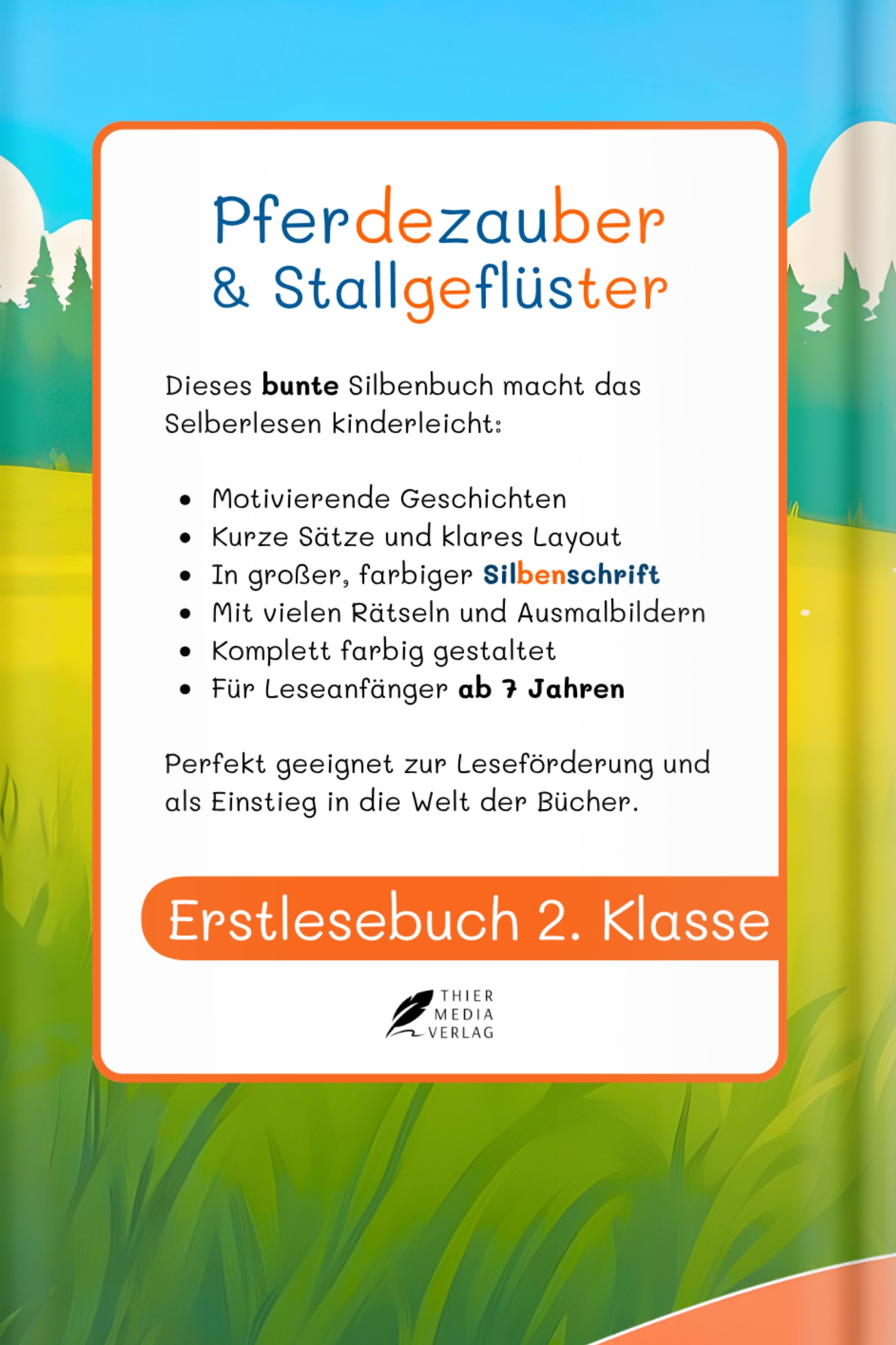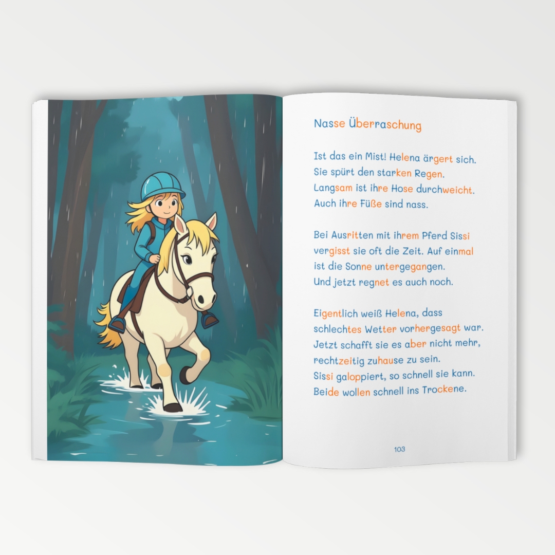 Pferdezauber und Stallgeflüster - das Lesebuch für kleine Pferdefans ab 7 Jahren!Dieses liebevoll gestaltete Erstlesebuch entführt Mädchen und Jungen in spannende Reiterhofabenteuer. Mit 34 kurzen Silbengeschichten lernen Kinder spielerisch lesen und erleben zugleich Geschichten rund um Freundschaft, Ponys und Stallgeheimnisse.Die Texte sind in farbiger Silbenschrift geschrieben - so erkennen Kinder Wörter leichter, verbessern ihren Lesefluss und steigern Schritt für Schritt ihre Lesesicherheit. Dank großer Schrift, klarer Struktur und einfacher Sätze wird das Lesen nicht zur Herausforderung, sondern zum Erfolgserlebnis.Für zusätzliche Abwechslung sorgen Rätsel und Ausmalbilder, die Kreativität und Konzentration fördern. Das farbenfrohe Design und die bunten Illustrationen wecken Freude am Lesen und motivieren auch Kinder, die sich bisher schwertun.Ob zu Hause, in der Schule oder als Geschenk - dieses pädagogisch wertvolle Lesebuch ist ideal für die 2. Klasse und begleitet Kinder auf ihrem Weg zu sicheren Leserinnen und Lesern.