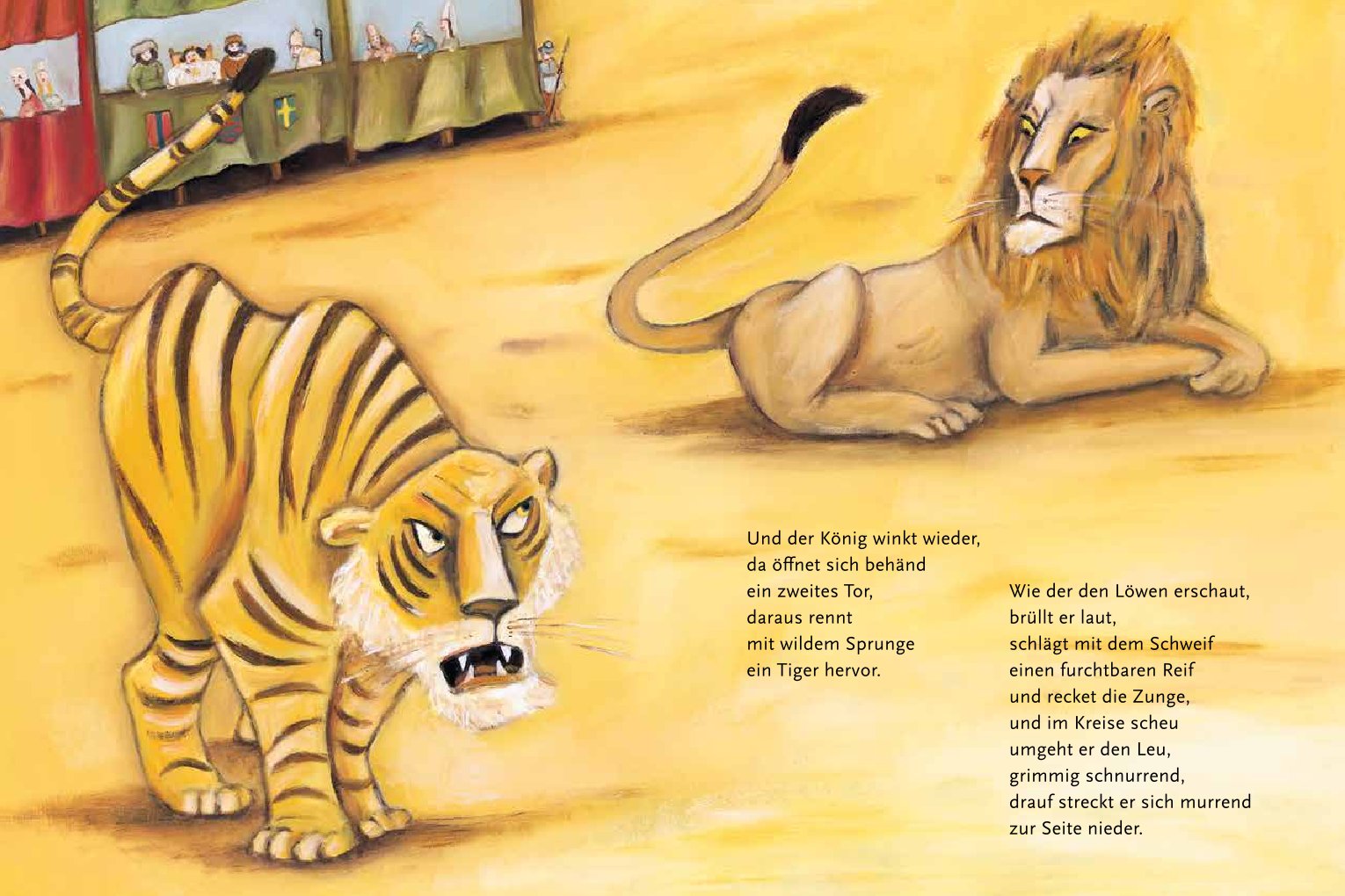 »Vor seinem Löwengarten, das Kampfspiel zu erwarten, saß König Franz ...« Und bald schon balgen sich brüllende Leoparden, Löwen und Tiger vor dem erlauchten Publikum um die Wette. Plötzlich aber fällt Fräulein Kunigundes Handschuh mitten zwischen die hungrigen Katzen. Eine willkommene Gelegenheit für die hochmütige Dame, ihren Herzensritter Delorges auf die Probe zu stellen: Zum Beweis seiner Liebe soll er in die sprichwörtliche Höhle des Löwen hinabsteigen und ihr den Handschuh zurückbringen ...