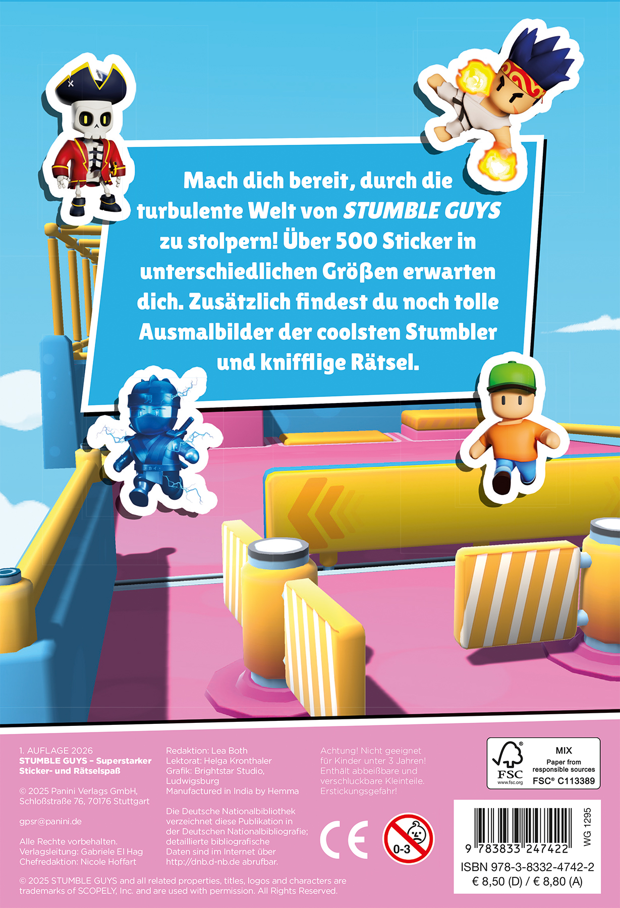 Mach dich bereit, durch die turbulente Welt von STUMBLE GUYS zu stolpern! Über 500 Sticker in unterschiedlichen Größen erwarten dich. Zusätzlich findest du noch tolle Ausmalbilder der coolsten Stumbler und knifflige Rätsel.