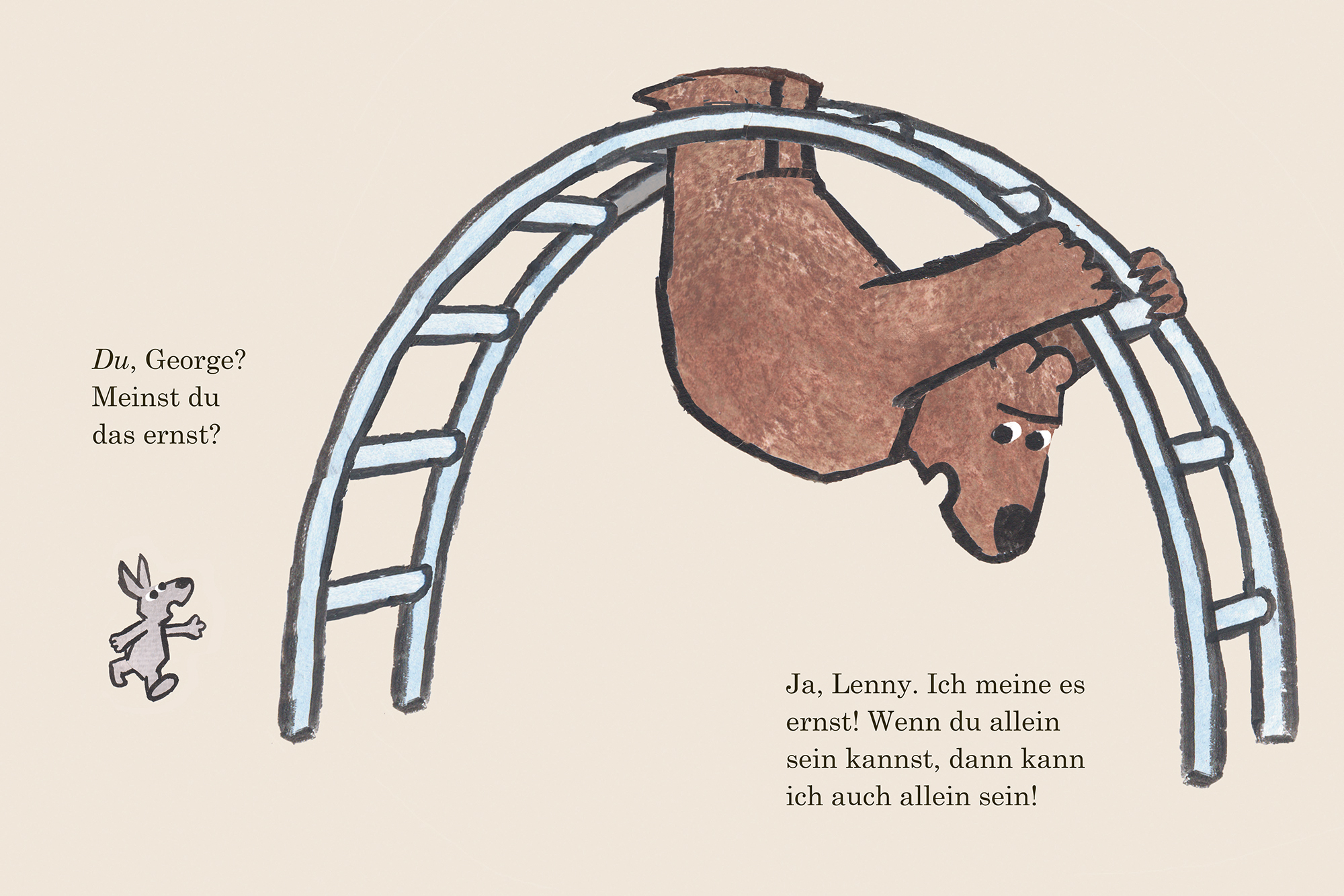 George und Lenny machen immer alles gemeinsam. Bis eines Tages Hase Lenny entscheidet, dass er unbedingt wissen will, wie es ist, allein zu sein. Bär George möchte gerne mitmachen, aber Lenny besteht darauf, dass allein sein zu zweit nicht geht. Also beschließt George, dass auch er allein sein kann. Während Lenny zunächst die Zeit für sich genießt, fehlt ihm der große Freund irgendwann sehr. So macht er sich auf die Suche nach George und entdeckt, dass sein Bärenfreund gar nicht so weit weg ist …