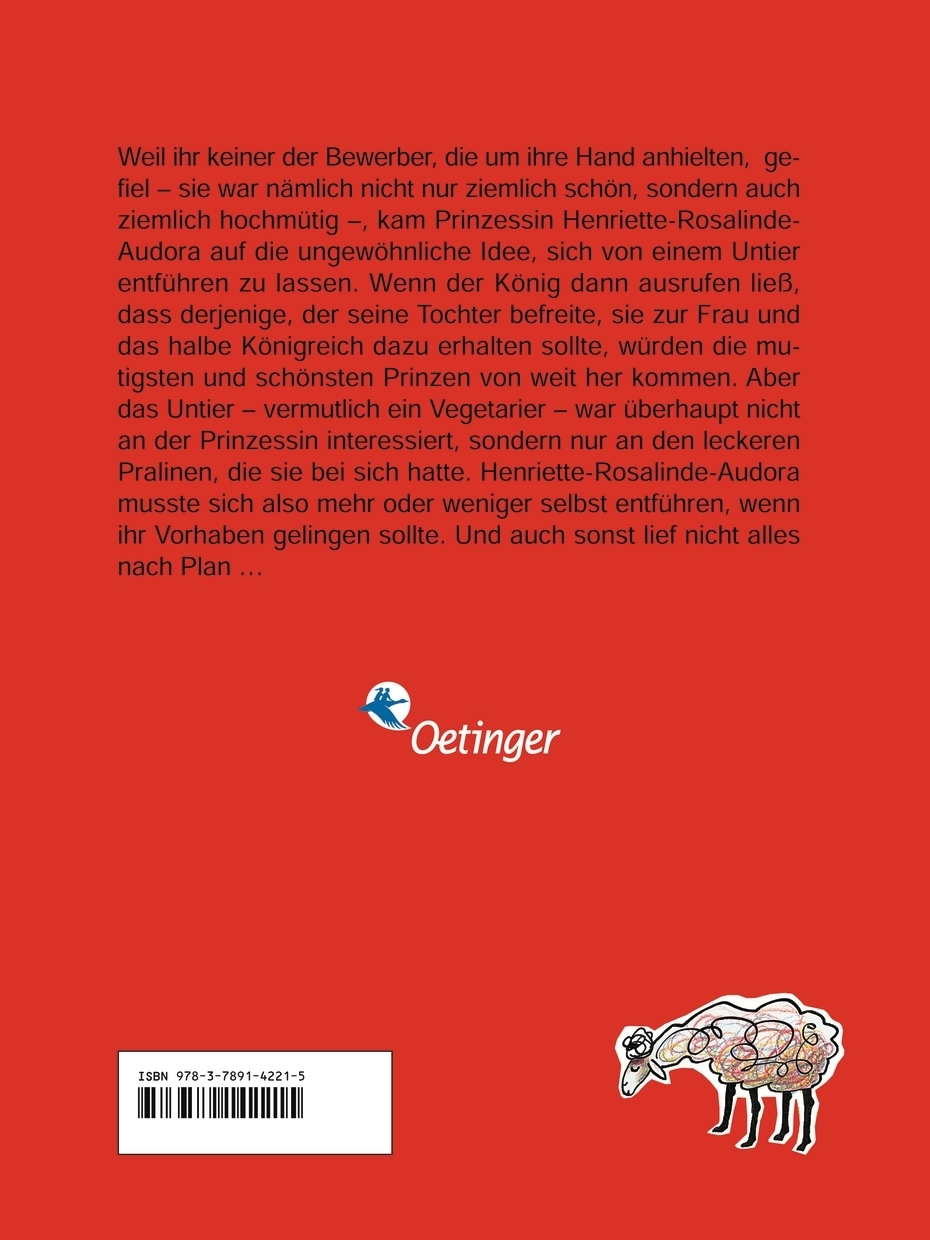 Weil ihr keiner der Bewerber, die um ihre Hand anhielten, gefiel - sie war nämlich nicht nur ziemlich schön, sondern auch ziemlich hochmütig -, kam Prinzessin Henriette-Rosalinde- Audora auf die ungewöhnliche Idee, sich von einem Untier entführen zu lassen. Wenn der König dann ausrufen ließ, dass derjenige, der seine Tochter befreite, sie zur Frau und das halbe Königreich dazu erhalten sollte, würden die mutigsten und schönsten Prinzen von weither kommen. Aber das Untier - vermutlich ein Vegetarier - war überhaupt nicht an der Prinzessin interessiert, sondern nur an den leckeren Pralinen, die sie bei sich hatte. Henriette-Rosalinde-Audora musste sich also mehr oder weniger selbst entführen, wenn ihr Vorhaben gelingen sollte. Und auch sonst lief nicht alles nach Plan...