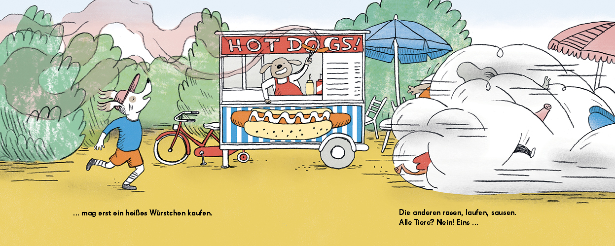 Achtung, das Wettrennen beginnt! Keiner, der hier nicht mitflitzen will: Bär und Nashorn, Schnecke, Igel, Elefant und - na klar - die schnellen Hasen. Alle starten, rennen, rasen durch den sommerlichen Park, alle wollen Erste sein. Es sei denn ... es tanzen plötzlich Seifenblasen durch die Luft, oder es duftet gut nach heißen Würstchen. Bei diesem lustigen Wettrennen toppt der Spaß den sportlichen Ehrgeiz! Ein Bilderbuch über die kindliche Freude am Kräftemessen und die noch größere an den Verlockungen eines Sommertages im Freien.