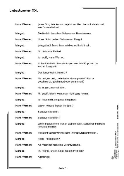 Hans-Peter Tiemann hat seiner Kreativität einmal mehr freien Lauf gelassen. Der jüngste Streich des erfolgreichen Theaterautors sind diese neuen "Starken Stücke". Ihre Theatergruppe wird mit jeder einzelnen seine helle Freude haben. Bereits das Einstudieren der temperamentvollen und packenden Stücke bereitet Ihren Schülerinnen und Schülern sehr viel Freude! Zahlreiche Rollen sorgen dafür, dass die ganze Klasse bei dem einzigartigen Theatererlebnis teilhaben kann. Die Stücke sind modern, pointenreich und sie werden jeden Theatersaal zum Beben bringen! Inhalt: Vater und Mutter Deppe glauben, ihr Sohn habe Liebeskummer. Dabei weint Marius nur, weil er für eine Klassenparty Zwiebeln schneidet. Achtung: Taschentuch-Garantie! 12 Seiten