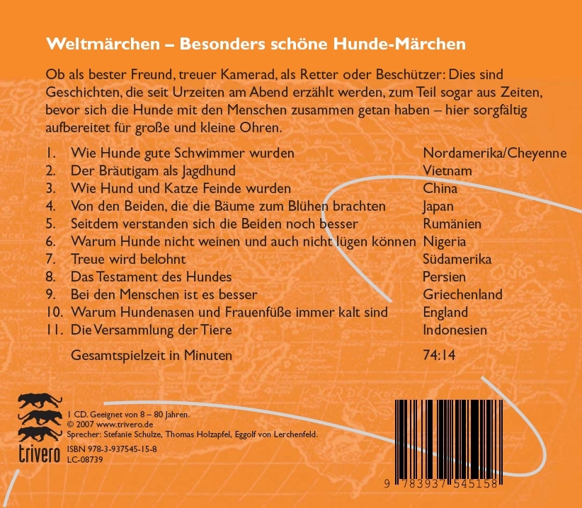 11 Hundemärchen einfach und stimmungsvoll von wunderbaren professionellen Sprechern nacherzählt, inhaltlich möglichst nah belassen an den ursprünglichen Versionen. Die Verschiedenartigkeit der Herkunfts-Kulturen verleiht dem Hörbuch einen ganz eigenen Zauber: Cheyenne, Vietnam, China, Japan, Rumänien, Nigeria, Südamerika, Persien, Griechenland, England und Indonesien