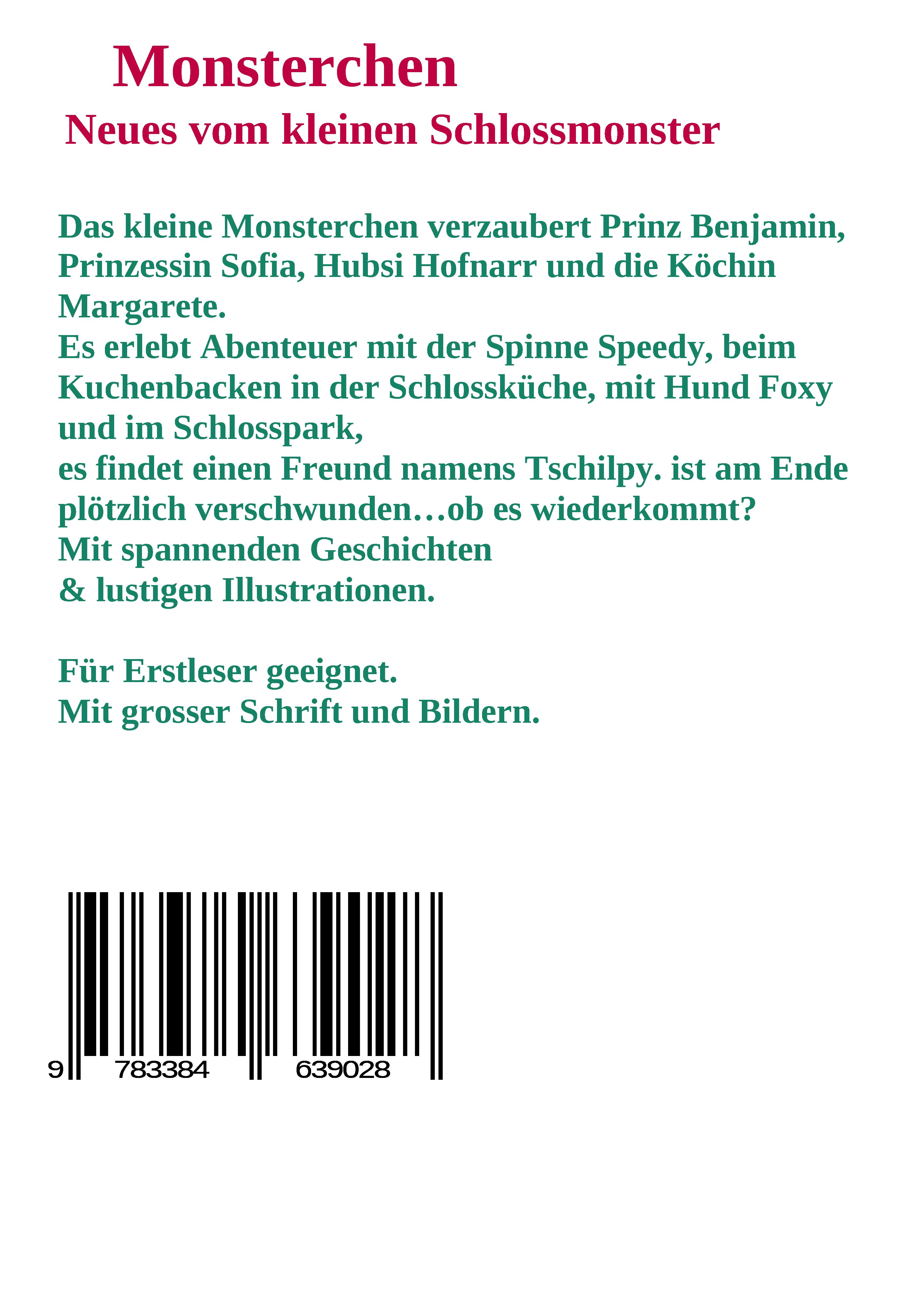 Das kleine Monsterchen verzaubert Prinz Benjamin, Prinzessin Sofia, Hubsi Hofnarr und die Köchin Margarete. Es erlebt Abenteuer mit der Spinne Speedy, beim Kuchenbacken in der Schlossküche, mit Hund Foxy und im Schlosspark, es findet einen Freund namens Tschilpy und ist am Ende plötzlich verschwunden...ob es wiederkommt?Mit spannenden Geschichten von Sandra Kroschel und lustigen Illustrationen von Sofia Kroschel.Für Erstleser geeignet. Mit grosser Schrift und Bildern. Sehr heiter geschrieben, leicht zu lesen. Lustige kurze Geschichten für Erstleser ab 7 Jahren.