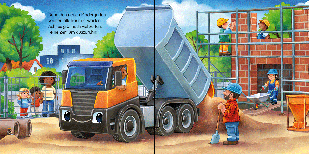 Den ganzen Tag haben der kleine Laster und seine Freunde auf der Baustelle geschuftet. Bis der neue Kindergarten fertig ist, muss so viel planiert, gegraben und geschichtet werden. Doch nun sind sie müde und der kleine Laster wünscht allen nacheinander eine gute Nacht.