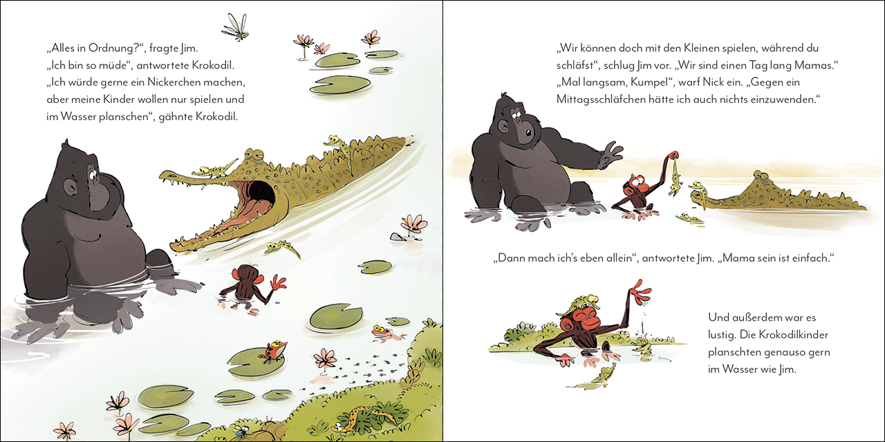 Mama Krokodil ist müde. Sie würde so gern schlafen, aber ihre Kinder wollen die ganze Zeit spielen und planschen. „Kein Problem“, sagt Jim. „Ich bin einen Tag Mama und du kannst dich ausruhen.“ Bald passt Jim nicht nur auf die Krokodilkinder, sondern auch auf viele andere Tierkinder auf. Dabei merkt er schnell, dass Mama sein zwar lustig ist, aber alles andere als einfach. „ICH BRAUCHE EINE PAUSE!“, brüllt er, aber weglaufen kann er ja nicht. Zum Glück schwingt sich seine Mama aus den Bäumen und bringt alles wieder in Ordnung. „Es müsste einen Tag geben, an dem wir alle Mamas feiern. Oder einfach jeden Tag …“, überlegt Jim und umarmt seine Mama fest. Ein Hoch auf alle Mütter – ein humorvolles und liebevolles Bilderbuch über das turbulente und wunderschöne Leben mit Kindern!