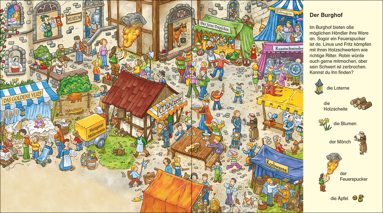 Wimmelige Ritterwelt Wie aufregend - eine richtige Burg! Im Burghof ist gerade ein wildes Turnier mit echten Rittern im Gange. Auf dem bunten Markt hämmert der Hufschmied auf seinem Eisen und der Feuerspucker führt seine brandgefährliche Kunst vor. Und wer erschreckt da frech die Besucher? Auf jeder Seite gibt es jede Menge zu entdecken und staunen. Ein riesiger Wimmel-Such-Spaß für kleine und große Ritterfreunde.