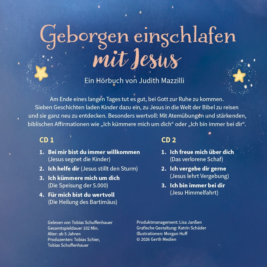 Zu hören sind sieben beruhigende Geschichten, die zum Träumen einladen. Jede nimmt Kinder mit auf eine Reise in die Zeit, in der Jesus gelebt hat. Dabei ist die Ansprache sehr einfühlsam. Die kleinen Zuhörerinnen und Zuhörer werden von der warmen Stimme des Erzählers Tobias Schuffenhauer innerlich abgeholt und in das Geschehen hineingenommen. Das federleichte Soundgewand und ausgewählte minimale Hintergrundgeräusche helfen dabei, dass Kinder ihre Gedanken auf die Reise schicken können und mit einem Gefühl der Geborgenheit einschlafen. Jede Geschichte vermittelt eine zentrale Botschaft von Jesus. Beispielsweise „Ich kümmere mich um dich“ oder „Ich bin immer bei dir“. Ein Jesus-zentriertes Konzept, das es Kindern erleichtert, zur Ruhe zu kommen.