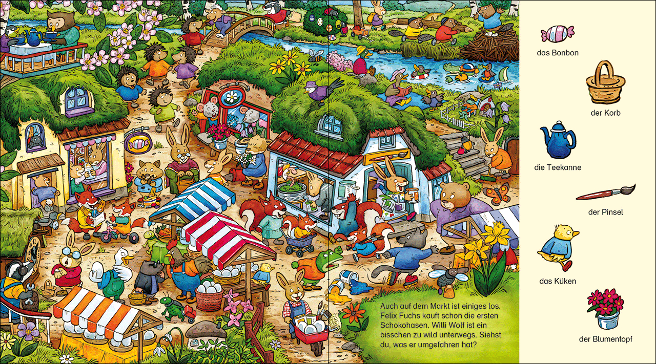 Endlich ist der Frühling da und Ostern steht vor der Tür! Die Tierkinder im Waldkindergarten malen die letzten Osterbilder und zuhause wird alles fröhlich dekoriert. Auch die anderen Waldtiere werkeln fleißig im Garten oder genießen das schöne Wetter am See. Währenddessen haben die Osterhasen im Osterhasenland alle Hände voll zu tun. Werden sie es schaffen, alle Ostereier rechtzeitig zu bemalen und zu verstecken?