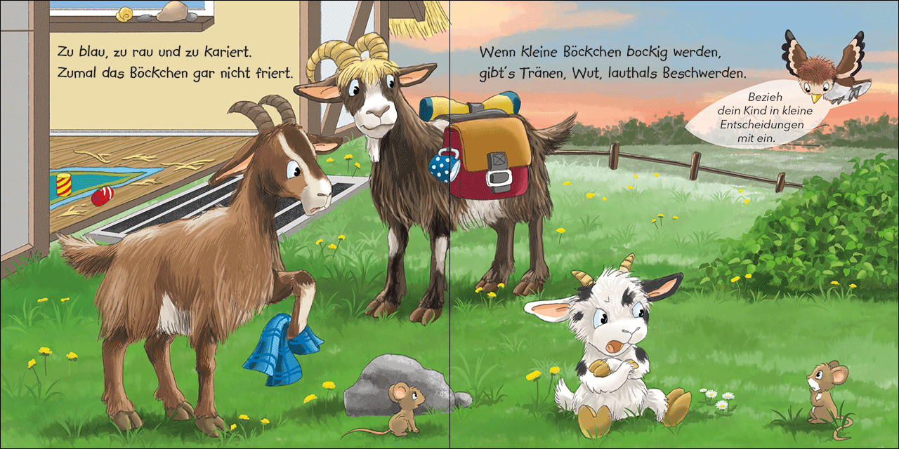 Böckchen komm, mach dich bereit. Wir müssen los, wird höchste Zeit. Noch das Tüchlein um den Hals… Das Tüchlein? Nein, das keinesfalls Zu rau, zu blau und zu kariert, zumal das Böckchen gar nicht friert. Ja, wenn kleine Böckchen bockig werden, gibt’s Tränen, Wut, lauthals Beschwerden. Dieses Buch zeigt, wie mit etwas Hilfe aus der miesen Laune doch noch ein Lächeln werden kann.