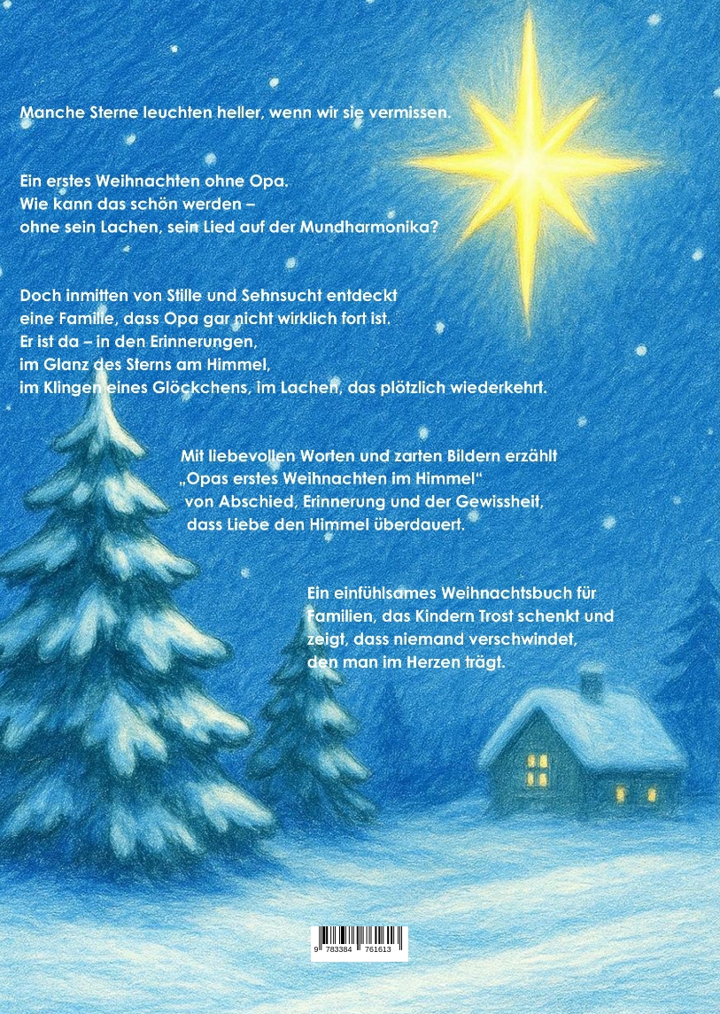 Ein liebevoll-tröstliches Weihnachtsbuch über den Verlust eines geliebten Menschen - behutsam erzählt für Kinder ab 3 Jahren.Als der geliebte Opa stirbt, steht die Familie vor ihrem ersten Weihnachten ohne ihn.Wie kann ein Fest voller Freude gelingen, wenn jemand so sehr fehlt?Doch im warmen Leuchten eines Sterns, im Klang der Mundharmonika und in vielen kleinen Erinnerungsmomenten spüren sie:Liebe endet nicht - sie bleibt."Opas erstes Weihnachten im Himmel" ist ein einfühlsames Bilderbuch über Trauer, Abschied, Erinnerung und Hoffnung.Es hilft Kindern, den Verlust eines Großelternteils zu verstehen, bietet Trost und zeigt, wie Erinnerungen Wärme schenken können.Dieses Buch ist ideal für:Familien, die mit Trauer umgehen müssenKinder, die einen Opa oder eine andere nahestehende Person verloren habenVorlesezeit im Kindergarten oder ZuhauseDie Weihnachtszeit, wenn Erinnerungen besonders spürbar sindGesprächsanlässe über Tod, Trauer & TrostExklusiv enthält dieses Buch einen einfühlsamen Zusatzteil, der Kindern und Erwachsenen hilft, eigene Gefühle zu verarbeiten:mit kindgerechten Impulsen zum Sprechen, Erinnern, Malen, Gestalten.Ein Mitmach-Bereich, der Trost schenkt und Raum gibt für das, was im Herzen bleibt.Eine liebevoll illustrierte Geschichte, die zeigt:Was man im Herzen trägt, kann man nicht verlieren.