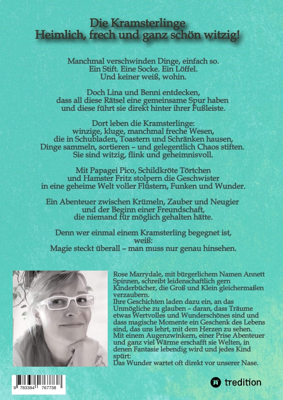 Manchmal verschwinden Dinge, einfach so.Ein Stift. Eine Socke. Ein Löffel.Und keiner weiß, wohin.Doch Lina und Benni entdecken,dass all diese Rätsel eine gemeinsame Spur haben -direkt hinter ihrer Fußleiste.Dort leben die Kramsterlinge:winzige, kluge, manchmal freche Wesen,die in Schubladen, Toastern und Schränken hausen,Dinge sammeln, sortieren - und gelegentlich Chaos stiften.Mit Papagei Pico, Schildkröte Törtchenund Hamster Fritz stolpern die Geschwisterin eine geheime Welt voller Flüstern, Funken und Wunder.Ein Abenteuer zwischen Krümeln, Zauber und Neugier -und der Beginn einer Freundschaft,die niemand für möglich gehalten hätte.Denn wer einmal einem Kramsterling begegnet ist,weiß:Magie steckt überall - man muss nur genau hinsehen.