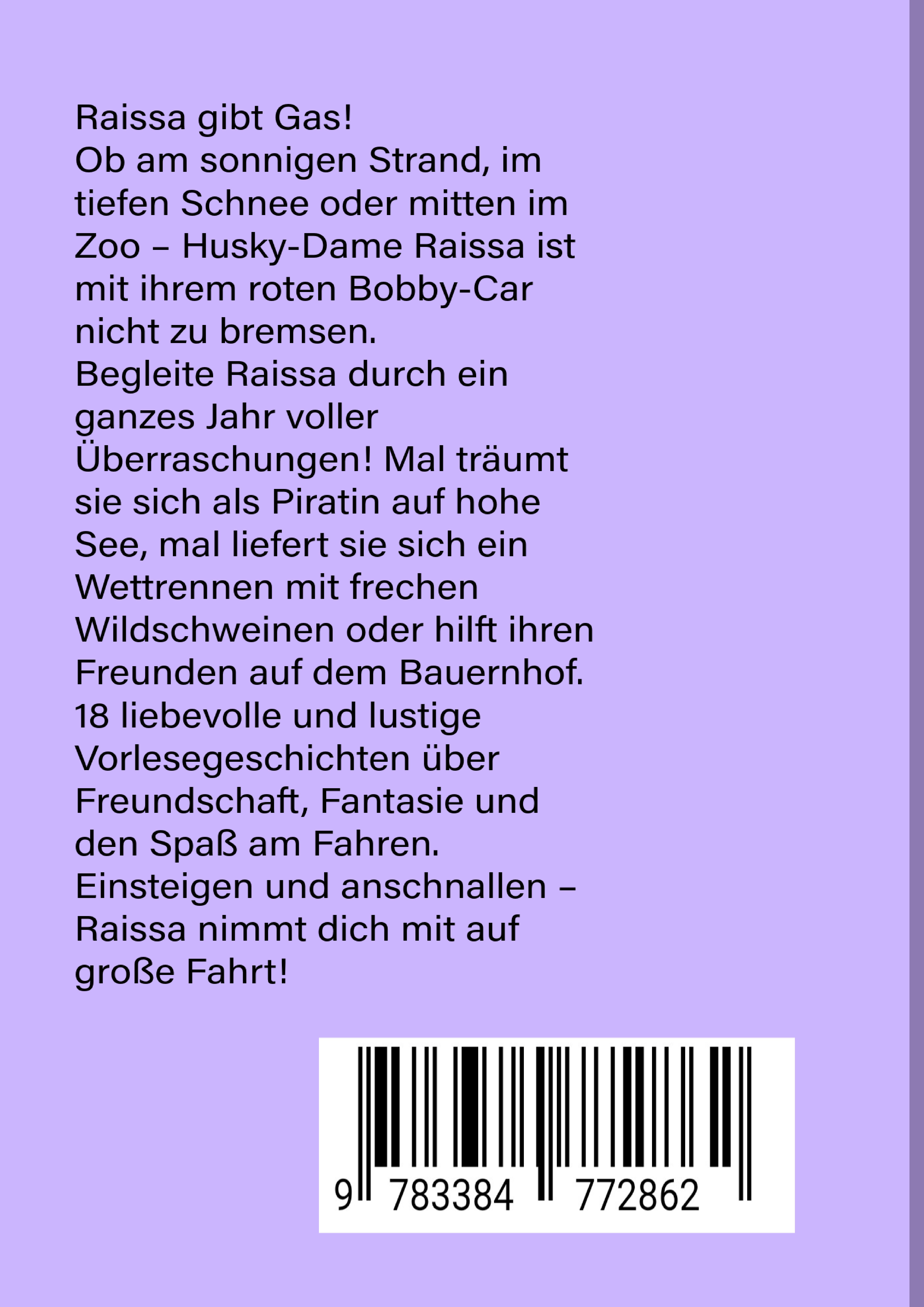 In dem Buch werden lustige Abenteuer der kleinen Husky-Hündin Raissa aus Sibirien beschrieben. Sie flitzt mit ihrem roten Bobby-Car durch verschiedene Situationen.