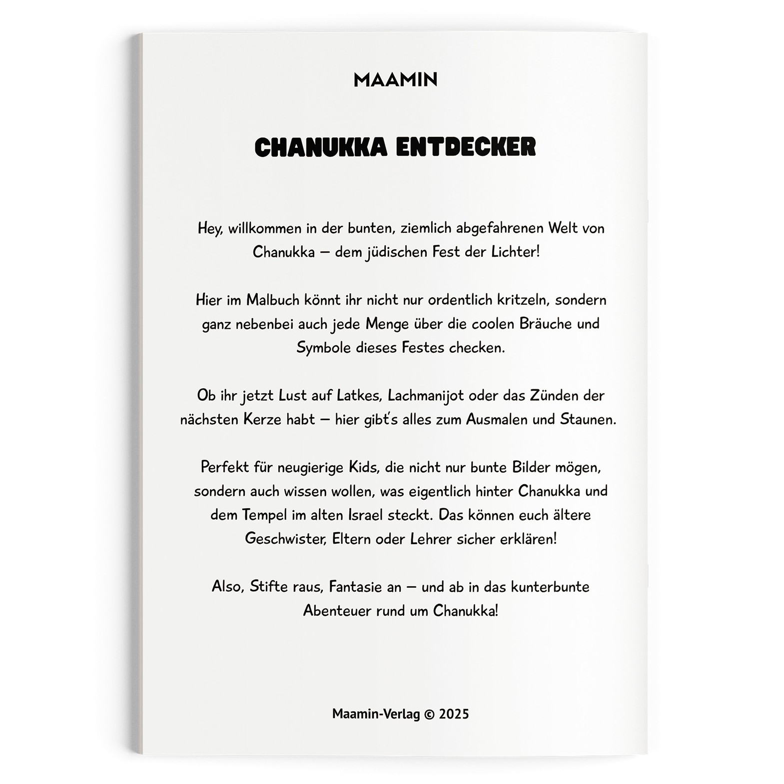 | Schlagworte | Aktivitäten für Chanukka • Ausmalbuch für Chanukka • Chagim • Chanukka • Chanukka Ausmalbuch • Chanukka Buch • Chanukka für Kinder • Chanukka Kinderbuch • Chanukka malen • Hebräisch • Israel • Judentum • Jüdisch • jüdische kinderbücher • Jüdische Malbücher • Kinderbuch für Chanukka • Lichterfest • Malbuch |