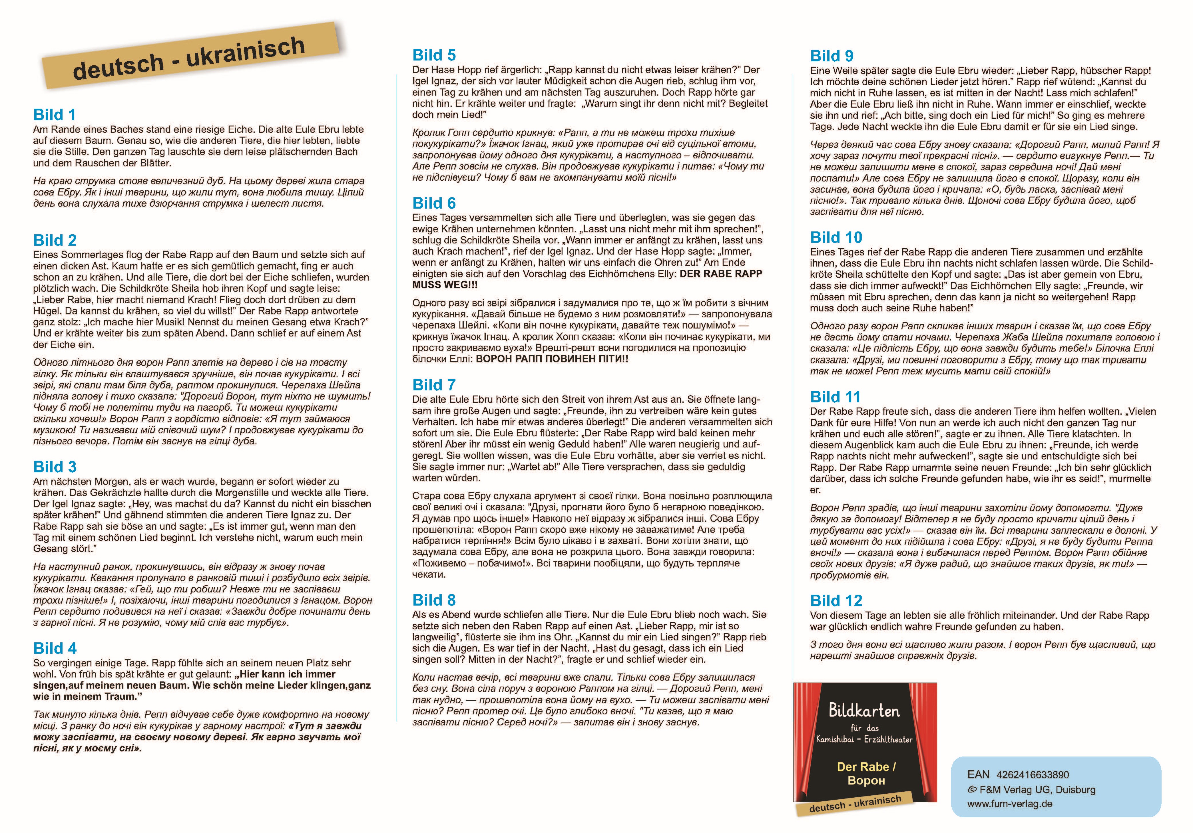 Zweisprachige Bildkarten der Bilderbuchgeschichte "Der Rabe" für das Kamishibai-Theater in deutsch/ukrainisch