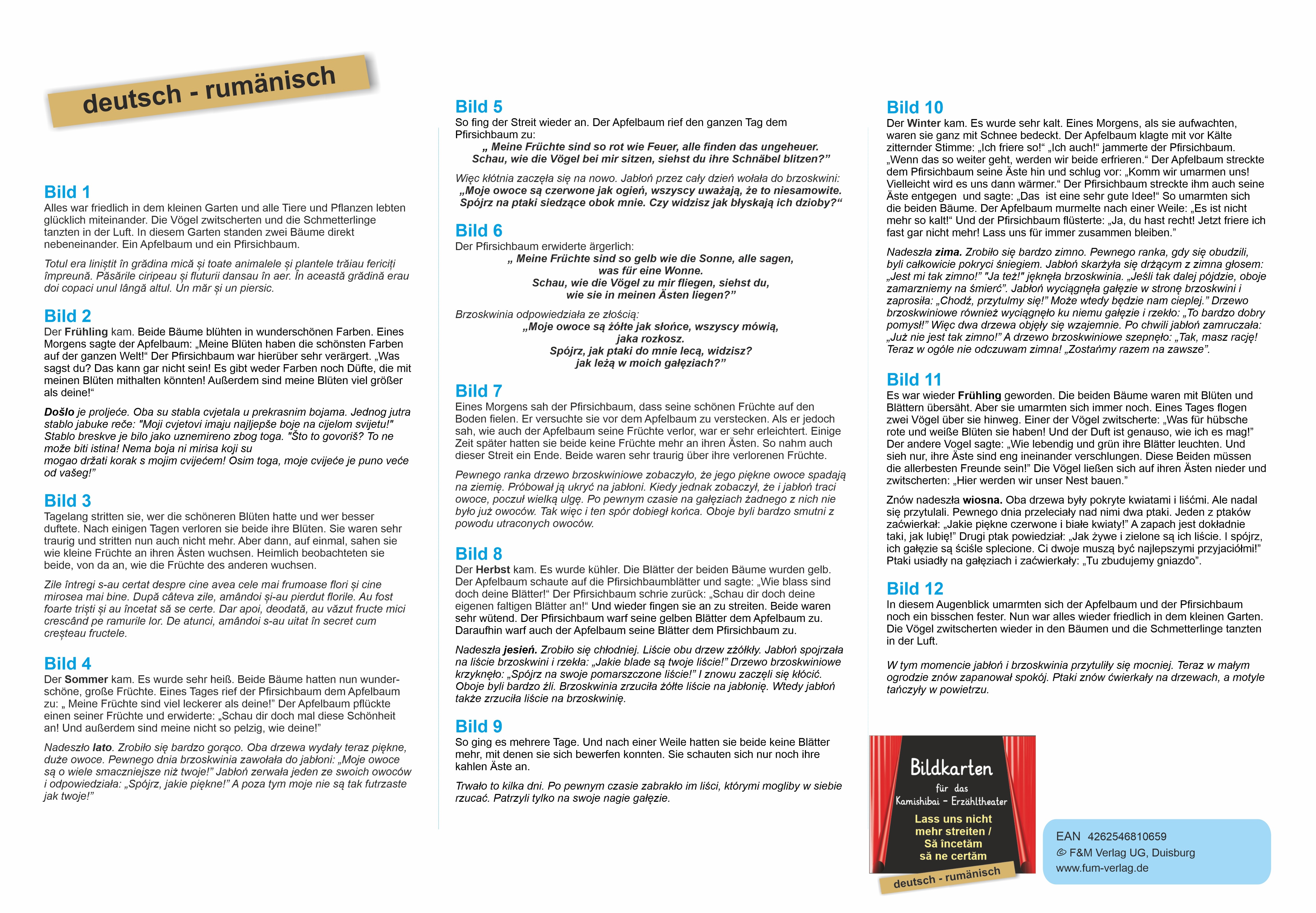 | Schlagworte | Bildkarte • Bildkarten • Erzähltheater • Kamishibai • Rumänisch • Sprachförderung • Streit |
