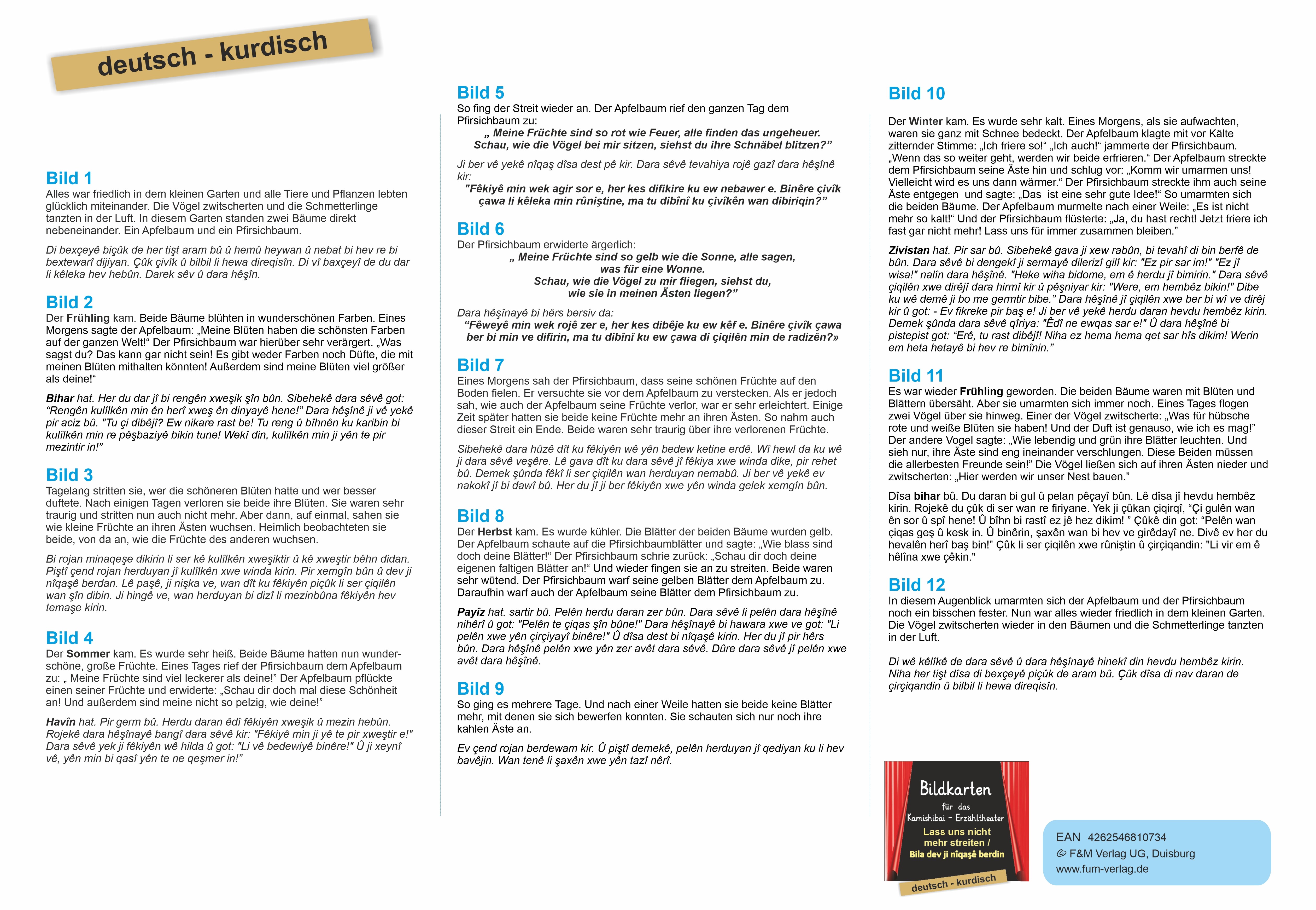 | Schlagworte | Bildkarte • Bildkarten • Erzähltheater • Kamishibai • Kurdisch • Sprachförderung • Streit |