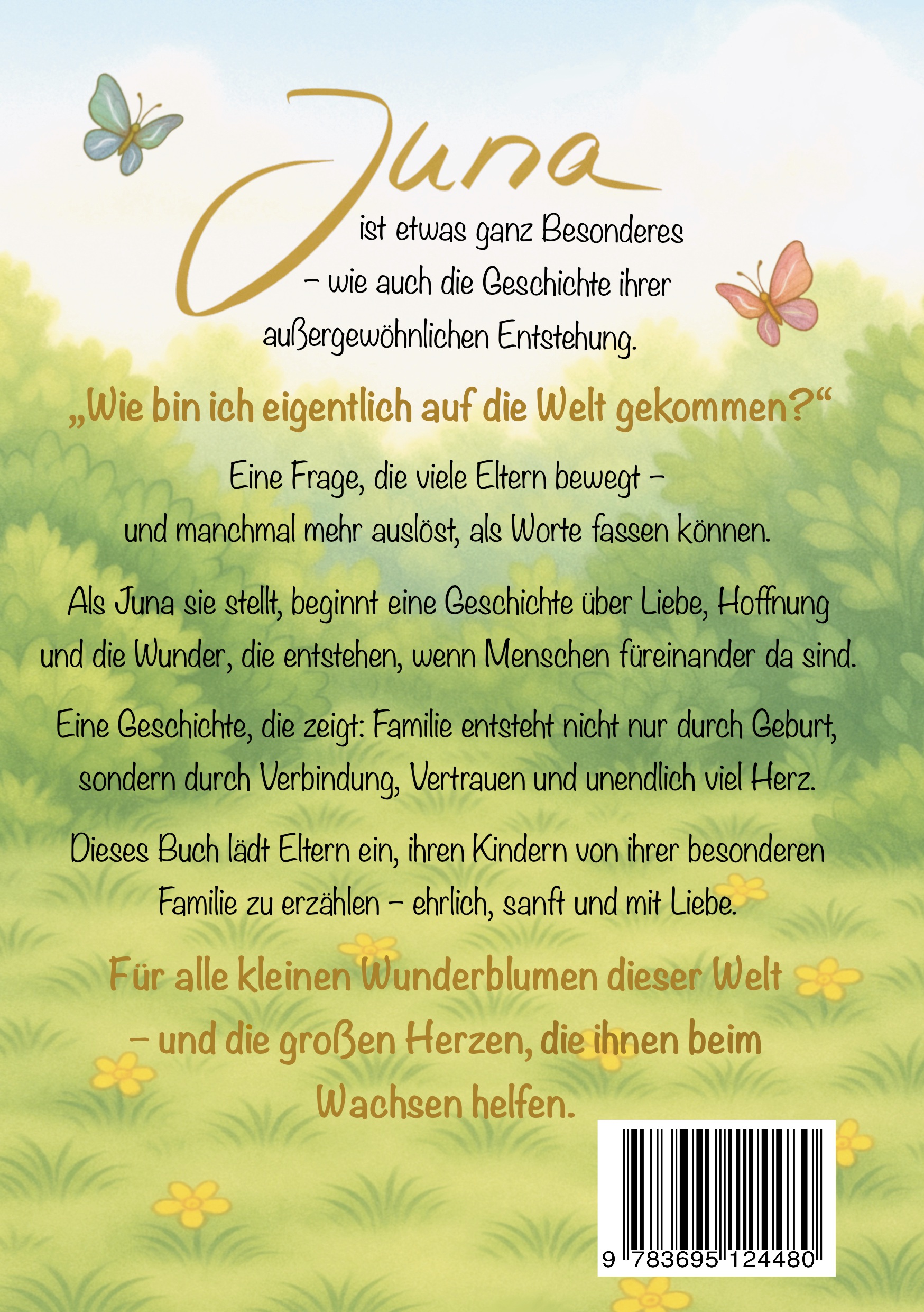 Als Juna wissen will, wie sie auf die Welt kam, erzählen ihre Eltern die Geschichte einer Wunderblume, die an einem besonderen Ort wachsen durfte. Ein einfühlsames Bilderbuch über Familienvielfalt - besonders für Kinder, die durch Adoption, Pflege, Leihmutterschaft oder ihren ganz eigenen Weg in ihre Familie kamen. Es hilft gleichermaßen zu erklären als auch zu verstehen: Du bist gewollt. Du bist geliebt. Du bist ein Wunder.