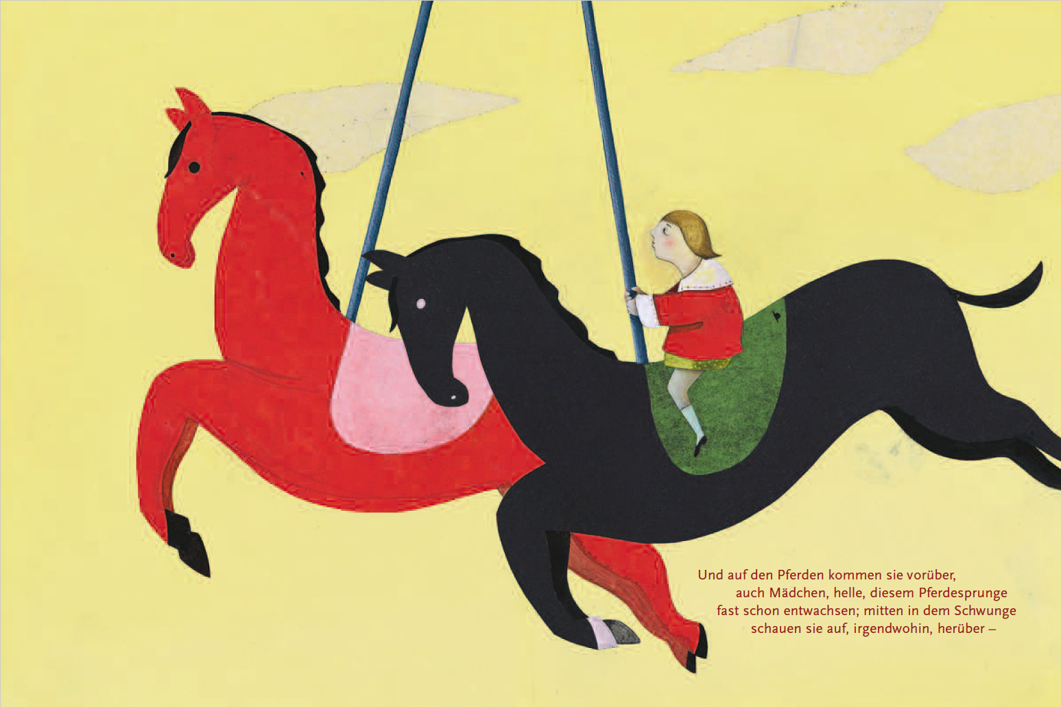 Seit über 100 Jahren schon dreht sich Rilkes Karussell, eines der schönsten Gedichte der deutschen Lyrik. Stimmungsvoll und mitreißend wird "dieses atemlose, blinde Spiel" der kreisenden Kinder und Tiere beschrieben: Bunte Pferde, ein roter Löwe, angespannte Wagen, ein Hirsch mit Sattel - vorbei fliegende Farben, dazu die traumhaft verspielten Bilder der Künstlerin Isabel Pin: Unwillkürlich wird man in den Bann gezogen und taucht für eine Weile ein in diese sich endlos drehende, ziellos bunte Fantasiewelt eines Karussells ...