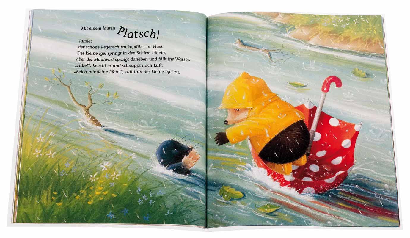 Doch als es unaufhörlich weiterregnet und auch noch ein heftiger Sturm aufkommt, beginnt für den kleinen Igel ein großes Abenteuer.