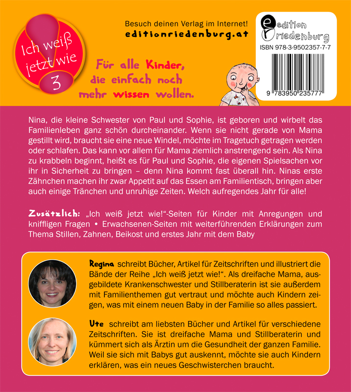 * Regina schreibt Bücher, Artikel für Zeitschriften und illustriert die Bände der Reihe „Ich weiß jetzt wie!“. Als dreifache Mama, ausgebildete Krankenschwester und Stillberaterin ist sie außerdem mit Familienthemen gut vertraut und möchte auch Kindern zeigen, was mit einem neuen Baby in der Familie so alles passiert. * Ute schreibt am liebsten Bücher und Artikel für verschiedene Zeitschriften. Sie ist dreifache Mama und Stillberaterin und kümmert sich als Ärztin um die Gesundheit der ganzen Familie. Weil sie sich mit Babys gut auskennt, möchte sie auch Kindern erklären, was ein neues Geschwisterchen braucht.