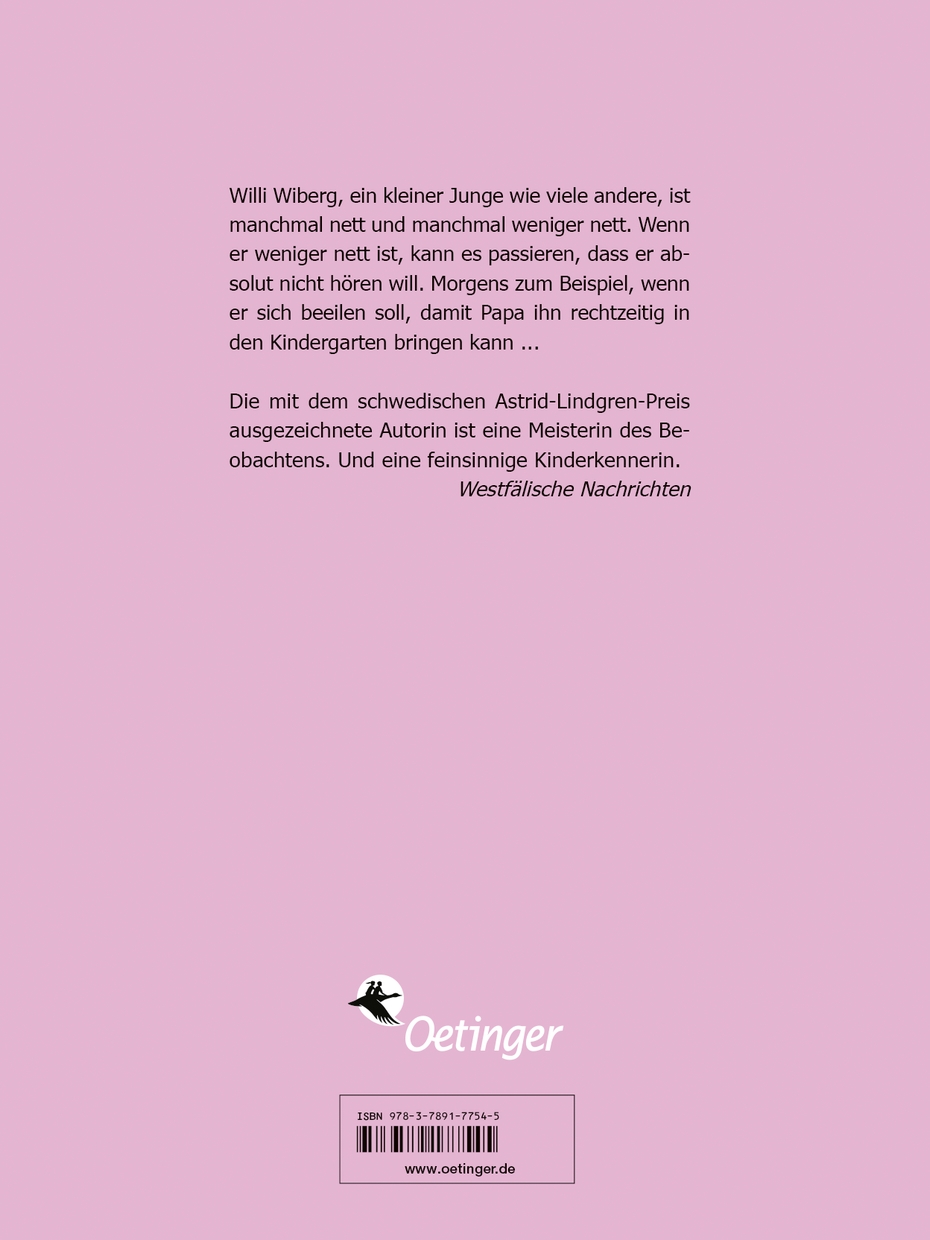 Willi Wiberg, ein kleiner Junge wie viele andere, ist manchmal nett und manchmal weniger nett. Wenn er weniger nett ist, kann es passieren,dass er absolut nicht hören will. Morgens zum Beispiel, wenn er sich beeilen soll, damit Papa ihn rechtzeitig in den Kindergarten bringen kann ...