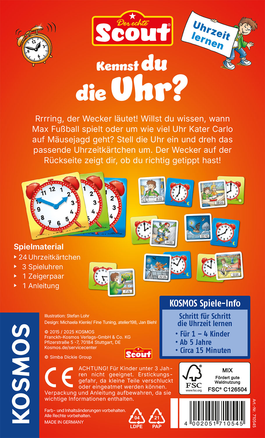Rrrring, der Wecker läutet! Willst du wissen, wann Max Fußball spielt oder um wie viel Uhr Kater Carlo auf Mäusejagd geht? Stell die Uhr ein und dreh das passende Uhrzeitkärtchen um. Der Wecker auf der Rückseite zeigt dir, ob du richtig getippt hast! Lustiges Memospiel für 2 bis 4 Spieler ab 5 Jahren. Spieldauer: ca. 15 Minuten.