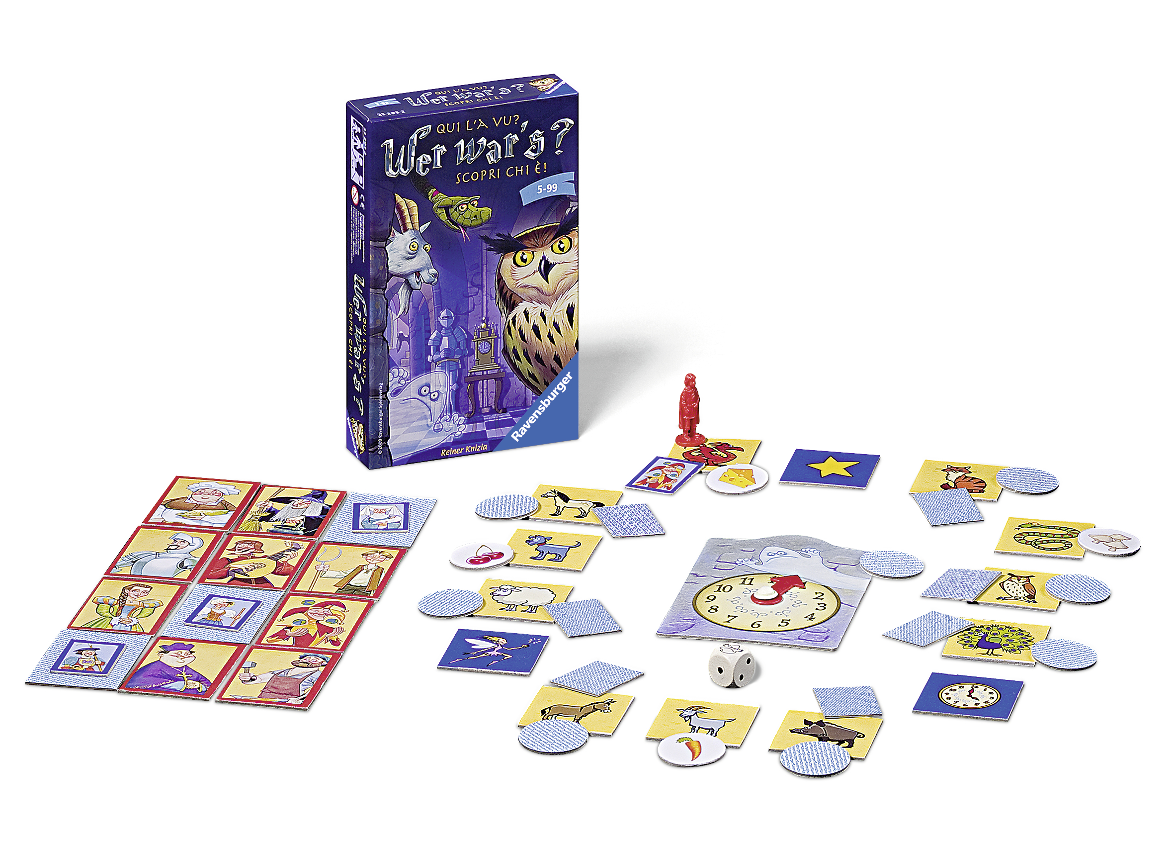 Wer hat den magischen Ring gestohlen? Wenn sich die Spieler die Hinweise der Tiere gut merken, erwischen sie den Dieb noch vor der Geisterstunde! Spiel-Inhalt: 11 Tierfelder, 3 Aktionsfelder, 12 Verdächtige, 12 Unschuldige, 12 Futterstücke, 1 Geisteruhr, 1 Spielfigur, 1 Symbolwürfel. Spieleranzahl: 2-5. Spieldauer: 10-15 Min. Spieleanleitung in deutsch, französisch, italienisch.