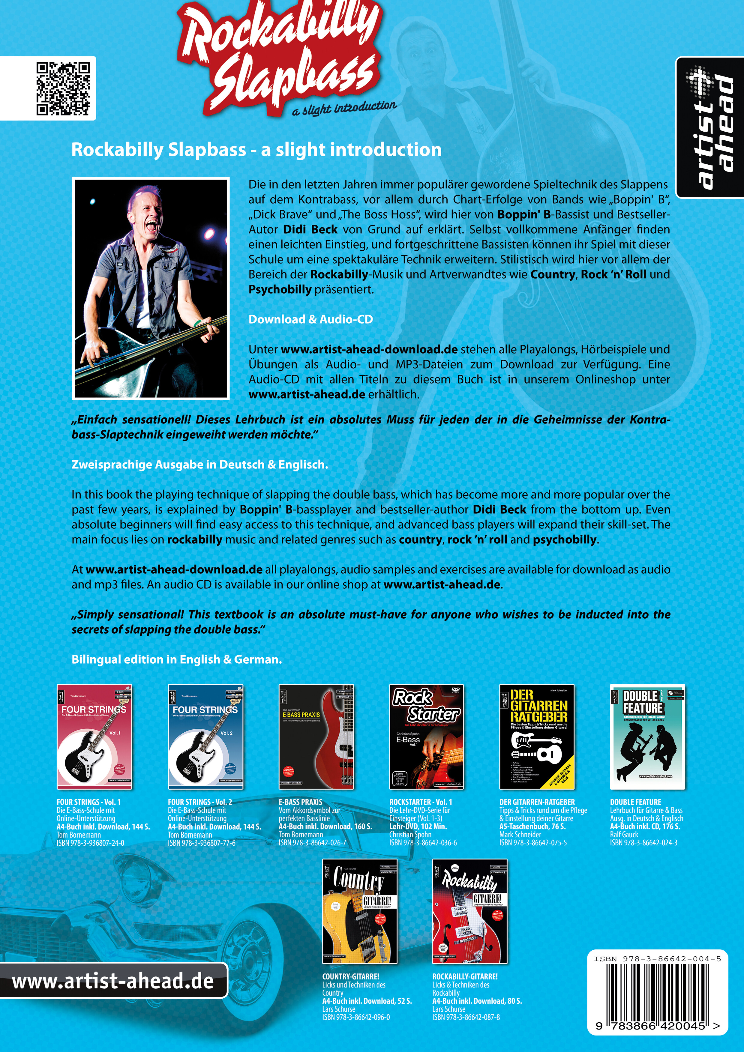 In this textbook the playing technique of slapping the double bass, which has become more and more popular over the past few years, is explained by Boppin' B-bassplayer and bestseller author Didi Beck from the bottom up. Even absolute beginners will find easy access to this technique and advanced bass players will expand their skill-set. The main focus lies on rockabilly music and related genres such as country, rock 'n' roll and psychobilly. At artist-ahead-download.de all playalongs, audio samples and exercises are downloadable as audio and mp3 files. An audio CD is available in our online shop at artist-ahead.de.