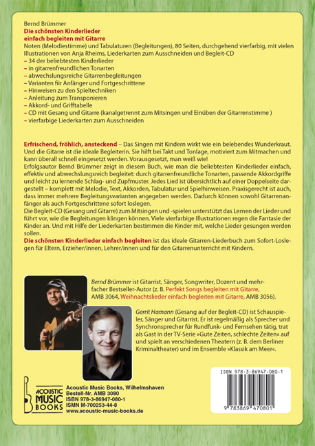 Bernd Brümmer ist Gitarrist, Sänger, Songwriter, Dozent und mehrfacher Bestseller-Autor (z.B. „Perfekt Songs begleiten mit Gitarre“, AMB 3064, „Weihnachtslieder einfach begleiten mit Gitarre“, AMB 3056). Gerrit Hamann (Gesang auf der Begleit-CD) ist Schauspieler, Sänger und Gitarrist. Er ist regelmäßig als Sprecher und Synchronsprecher für Rundfunk und Fernsehen tätig, trat als Gast in der TV-Serie „gute Zeiten, schlechte Zeiten“ auf und spielt an verschiedenen Theatern (z.B. dem Berliner Kriminaltheater) und im Ensemble „Klassik am Meer“.