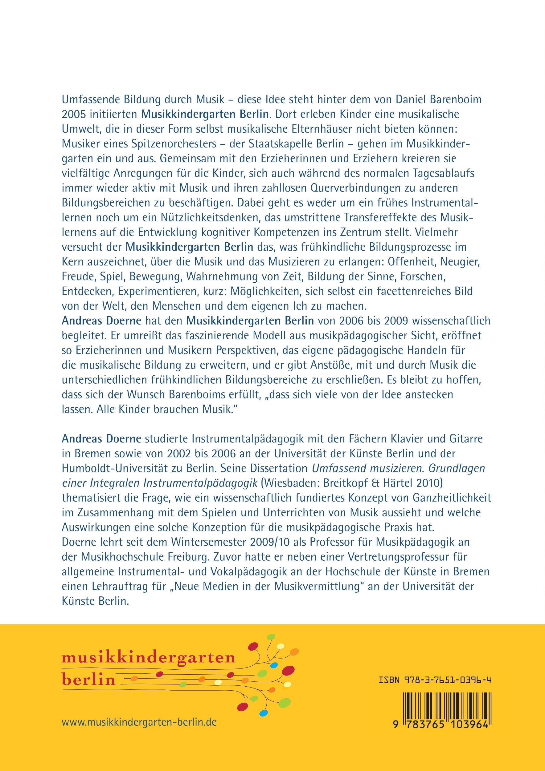 Auf Anregung Daniel Barenboims spielen seit 2005 Musiker der Staatskapelle Berlin im dortigen Musikkindergarten und integrieren dadurch klassische Musik in den Alltag der Zwei- bis Sechsjährigen. Musik wird so "selbstverständliche Ausdrucksform, schult täglich die Ohren, die Wahrnehmung und den sozialen Umgang" (so Barenboim im Geleitwort). Andreas Doerne umreißt das faszinierende Modell aus pädagogischer Sicht, um weitere Perspektiven zu einer ganzheitlichen Bildung durch Musik zu eröffnen. Das Nachwort von Pamela Rosenberg und Linda Reisch rundet das Büchlein ab.