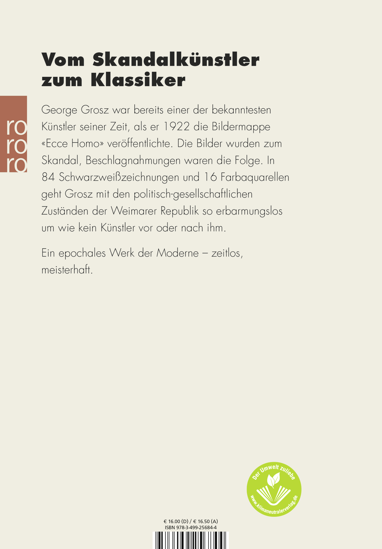 George Grosz war bereits einer der bekanntesten Künstler seiner Zeit, als er 1922 die Bildermappe «Ecce Homo» veröffentlichte. Die Bilder wurden zum Skandal, Beschlagnahmungen waren die Folge. In 84 Schwarzweißzeichnungen und 16 Farbaquarellen geht Grosz mit den politisch-gesellschaftlichen Zuständen der Weimarer Republik so erbarmungslos um wie kein Künstler vor oder nach ihm.