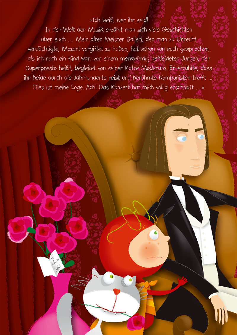 Entdecke die Wunder der klassischen Musik zusammen mit Superpresto und seinem treuen Freund, der Katze Moderato. Bei ihrer phantastischen Reise in das Land der Musik begegnen Superpresto und Moderato Franz Liszt, der ein grosses Herz und flinke Finger hat. Für kleine und grosse Musikliebhaber und solche, die es werden wollen. 36, Seiten, mit Hörbuch-CD. Erzählt von Andrea Schöning und Wolfgang Vogler