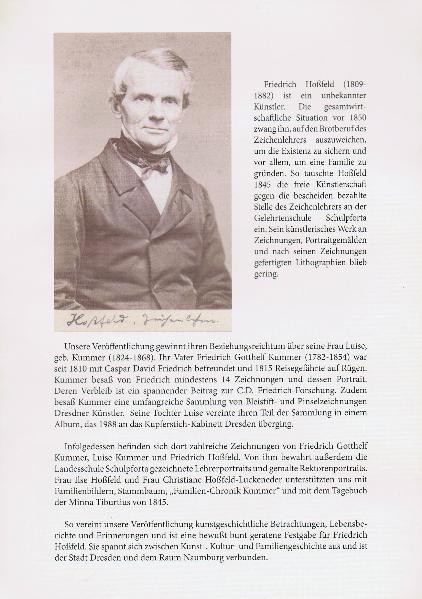 Unsere Veröffentlichung gewinnt ihren Beziehungsreichtum über seine Frau Luise, geb. Kummer (1824-1868). Ihr Vater Friedrich Gotthelf Kummer (1782-1854) war seit 1810 mit Caspar David Friedrich befreundet und 1815 Reisegefährte auf Rügen. Kummer besaß von Friedrich mindestens 14 Zeichnungen und dessen Portrait. Deren Verbleib ist ein spannender Beitrag zur C.D. Friedrich-Forschung. Zudem besaß Kummer eine umfangreiche Sammlung von Bleistift- und Pinselzeichnungen Dresdner Künstler. Seine Tochter Luise vereinte ihren Teil der Sammlung in einem Album, das 1988 an das Kupferstich-Kabinett Dresden überging. Infolgedessen befinden sich dort zahlreiche Zeichnungen von Friedrich Gotthelf Kummer, Luise Kummer und Friedrich Hoßfeld. Von ihm bewahrt außerdem die Landesschule Schulpforta gezeichnete Lehrerportraits und gemalte Rektorenportraits. Frau Ilse Hoßfeld und Frau Christiane Hoßfeld-Luckeneder unterstützten uns mit Familienbildern‚ Stammbaum, „Familien-Chronik Kummer“ und mit dem Tagebuch der Minna Tiburtius von 1845. So vereint unsere Veröffentlichung kunstgeschichtliche Betrachtungen, Lebensberichte und Erinnerungen und ist eine bewußt bunt geratene Festgabe für Friedrich Hoßfeld. Sie spannt sich zwischen Kunst-‚ Kultur- und Familiengeschichte aus und ist der Stadt Dresden und dem Raum Naumburg verbunden.