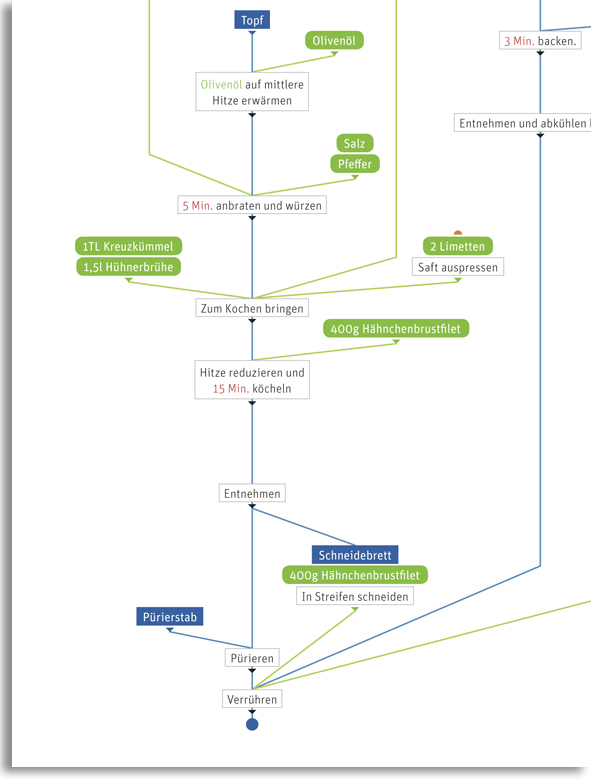 Ein Ablaufdiagramm hilft dabei! Man kocht einfach von oben nach unten. Die Linien zeigen dabei den Verlauf der Zutaten im Rezept und fügen sich im Laufe des Kochens zu einem leckeren Essen zusammen.