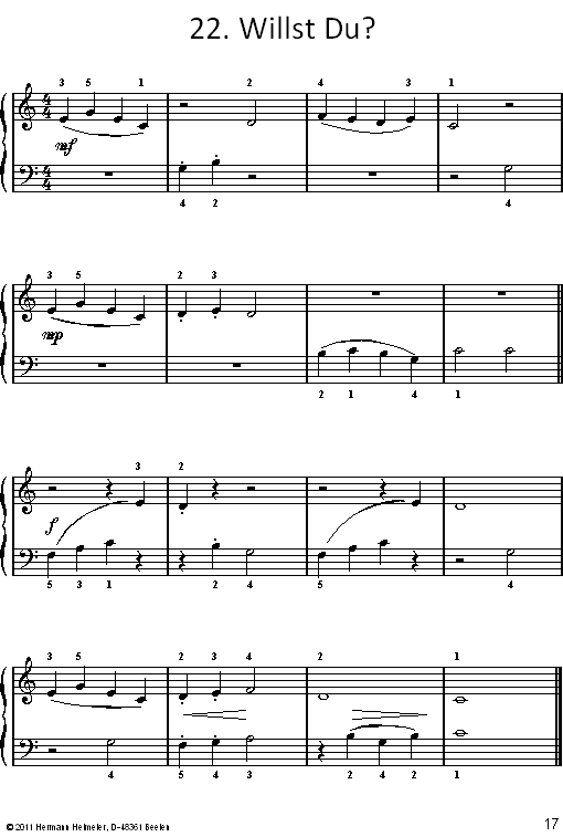 Die umfangreiche Sammlung ist nach steigendem Schwierigkeitsgrad aufgebaut, wobei die Noten für jede Hand zunächst einstimmig ausgelegt sind. Im weiteren Verlauf spielen linke und rechte Hand teilweise auch gleichzeitig.