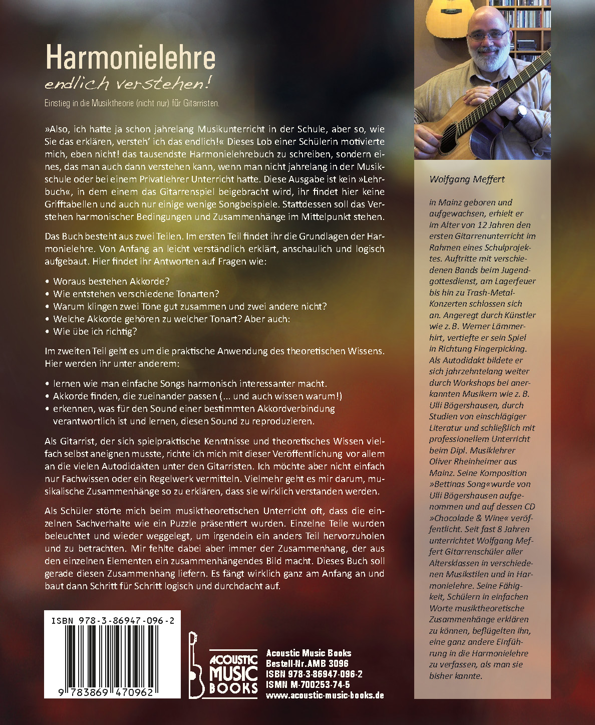 Wolfgang Meffert in Mainz geboren und aufgewachsen, erhielt er im Alter von 12 Jahren den ersten Gitarrenunterricht im Rahmen eines Schulprojektes. Auftritte mit verschiedenen Bands beim Jugendgottesdienst, am Lagerfeuer bis hin zu Trash-Metal-Konzerten schlossen sich an. Angeregt durch Künstler wie z. B. Werner Lämmerhirt, vertiefte er sein Spiel in Richtung Fingerpicking. Als Autodidakt bildete er sich jahrzehntelang weiter durch Workshops bei anerkannten Musikern wie z. B. Ulli Bögershausen, durch Studien von einschlägiger Literatur und schließlich mit professionellem Unterricht beim Dipl. Musiklehrer Oliver Rheinheimer aus Mainz. Seine Komposition »Bettinas Song«wurde von Ulli Bögershausen aufgenommen und auf dessen CD »Chocolade & Wine« veröffentlicht. Seit fast 8 Jahren unterrichtet Wolfgang Meffert Gitarrenschüler aller Altersklassen in verschiedenen Musiksti len und in Harmonielehre. Seine Fähigkeit, Schülern in einfachen Worte musiktheoretische Zusammenhänge erklären zu können, beflügelten ihn, eine ganz andere Einführung in die Harmonielehre zu verfassen, als man sie bisher kannte.