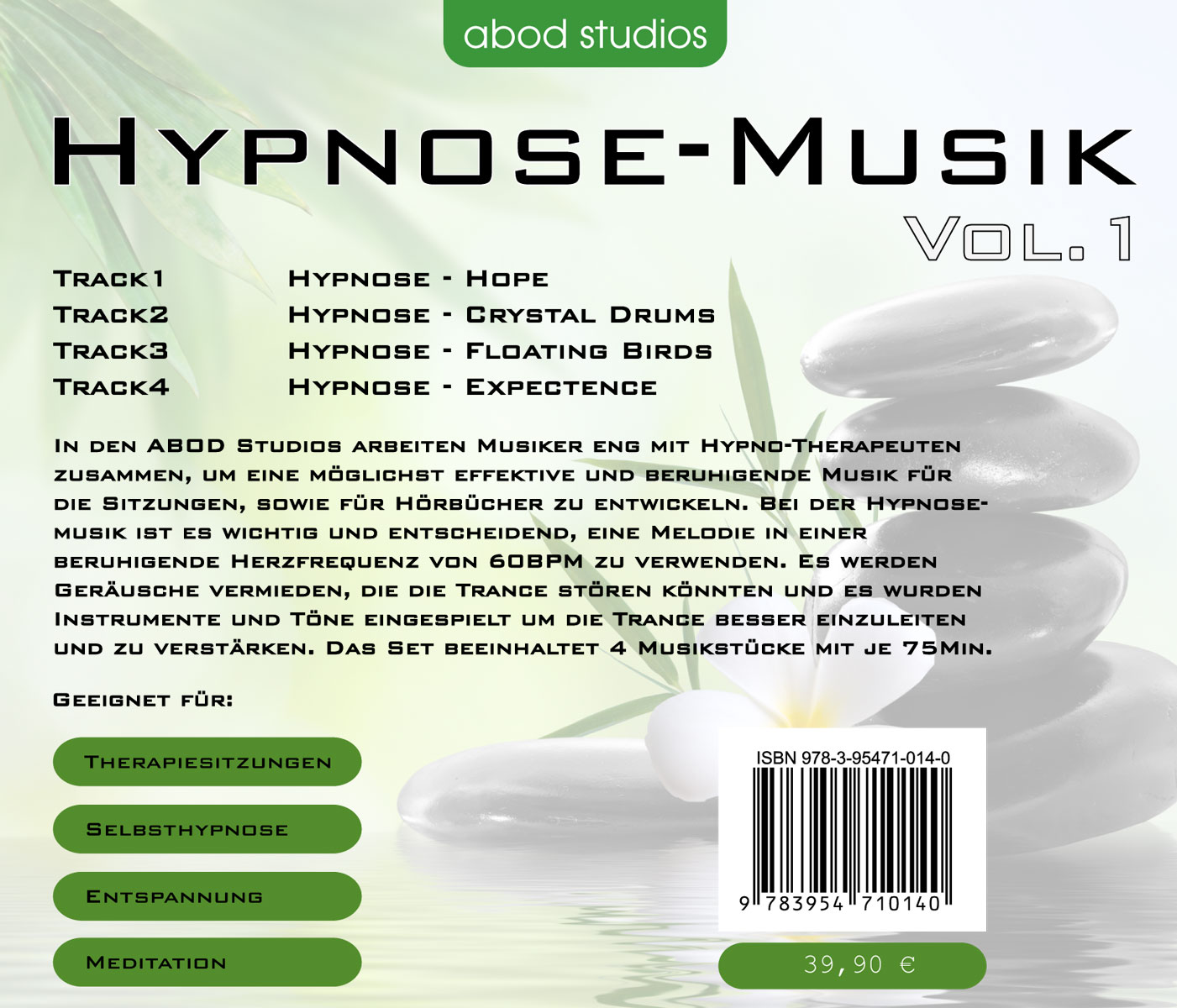 Hypnose-Musik für Ihre Therapieräume. In den ABOD Studios in München sind 4 Musikstücke entstanden um Ihre Klienten mühlelos und effektiv in eine angenehme Trance zu versetzen. Unterlegen Sie diese Musik mit Ihrer Stimme und sie werden mühelos den gewünschten Effekt erzielen. Jedes Stück hat eine Laufzeit von ca. 75 Minuten und wurde nach neuesten Erkentnissen in Zusammenarbeit mit Hypno-Therapeuten entwickelt. In Ihren eigenen Therapieräumen darf die Musik kommerziell verwendet werden. Eine Weitergabe oder zur eigenen Produktion von Hörbüchern, benötigen sie eine schriftliche Genehmigung von ABOD. Weitere Informationen dazu finden Sie im Internet unter www.abod.de.