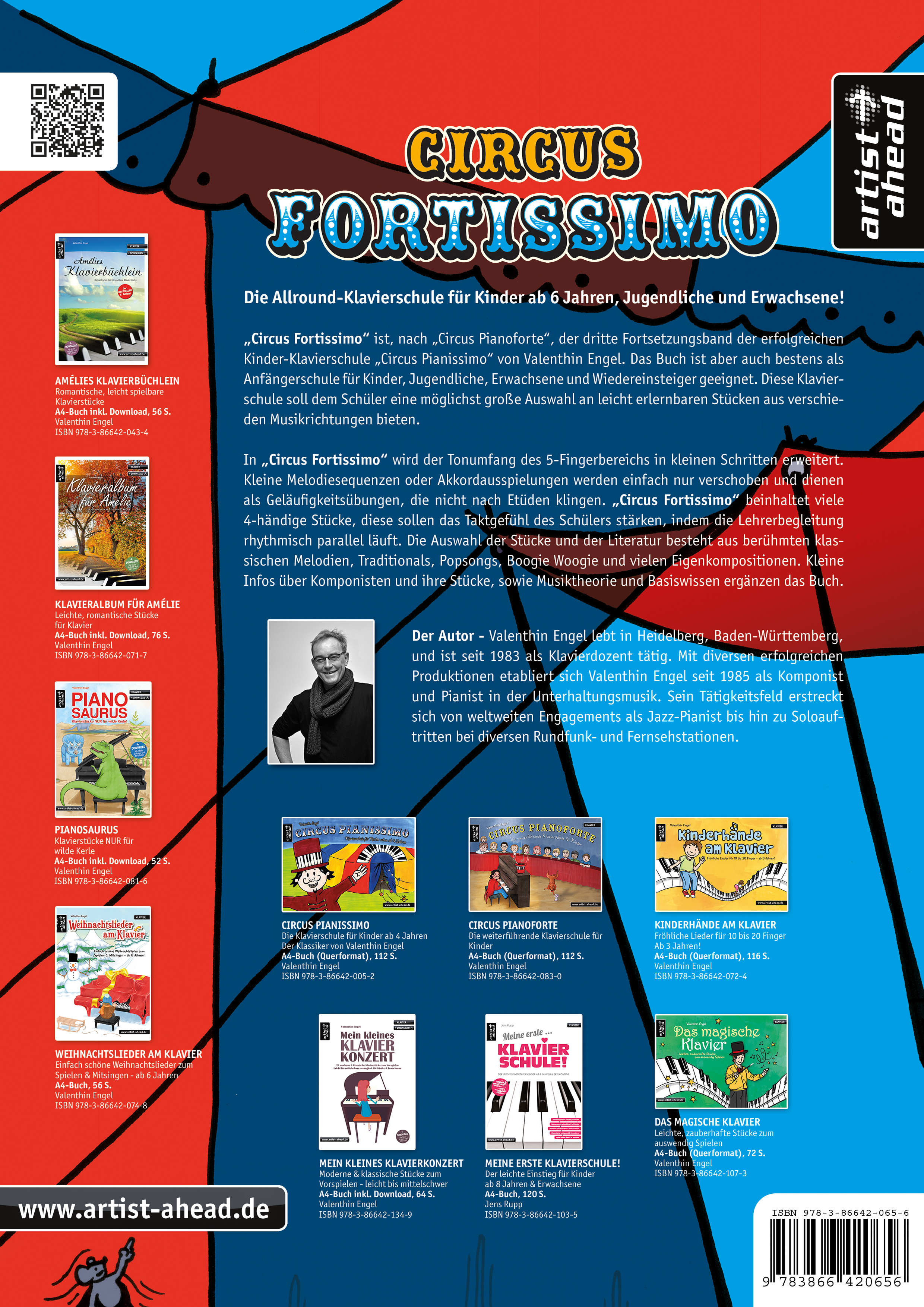 In Circus Fortissimo wird der Tonumfang des 5-Fingerbereichs in kleinen Schritten erweitert. Kleine Melodiesequenzen oder Akkordausspielungen werden einfach nur verschoben und dienen als Geläufigkeitsübungen, die nicht nach Etüden klingen. Circus Fortissimo beinhaltet viele 4-händige Stücke, diese sollen das Taktgefühl des Schülers stärken, indem die Lehrerbegleitung rhythmisch parallel läuft. Die Auswahl der Stücke und der Literatur besteht aus berühmten klassischen Melodien, Traditionals, Popsongs, Boogie Woogie und vielen Eigenkompositionen. Kleine Infos über Komponisten und ihre Stücke, sowie Musiktheorie und Basiswissen ergänzen das Buch.