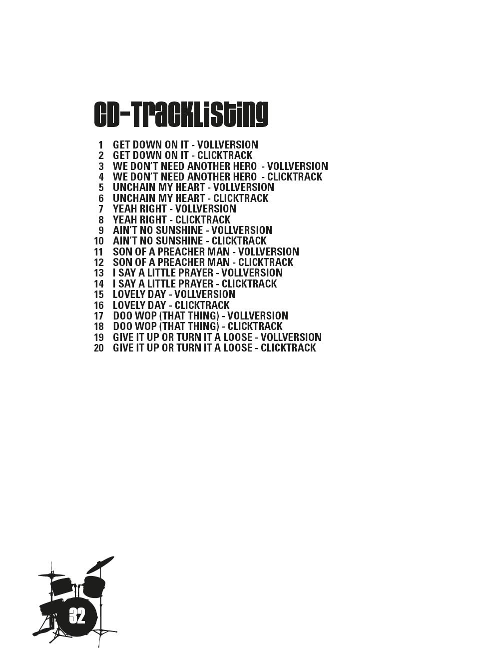 Die Drum Along-Serie von Bosworth erfreut sich aufgrund der einfachen, schnell erfassbaren Notation und der hohen Qualität der Play Along-Tracks großer Beliebtheit. Die Songs sind jeweils notiert als Leadsheet mit den verschiedenen Songteilen und den entsprechenden Drumbeats. Dadurch lässt sich der Ablauf des jeweiligen Songs wesentlich schneller lernen und man kann sich ganz auf die Drumparts und aufs Schlagzeugspielen konzentrieren – darum geht es ja schließlich. Die Backing Tracks sind von hoher Soundqualität mit einem - für Drummer essentiell – ausgeprägtem Bass. Auf der CD ist jeder Song als Vollversion mit Gesang und als Play Along-Version ohne Schlagzeug (und mit Clicktrack) enthalten. Der Text ist zweisprachig Deutsch und Englisch. Dieser Band kommt mit 10 Songs aus Black Music & Soul zum mitgrooven. Inhalt: Get down on it - Kool and the Gang; We don't need another hero - Tina Turner; Unchain my heart - Ray Charles; Yeah right - Dionne Bromfield; Ain't no sunshine - Bill Withers; Son of a preacher man - Dusty Springfield; I say a little prayer - Aretha Franklin; Lovely Day - Bill Withers; Doo Wop (that thing) - Lauryn Hill; Give it up or turn it a loose - James Brown.