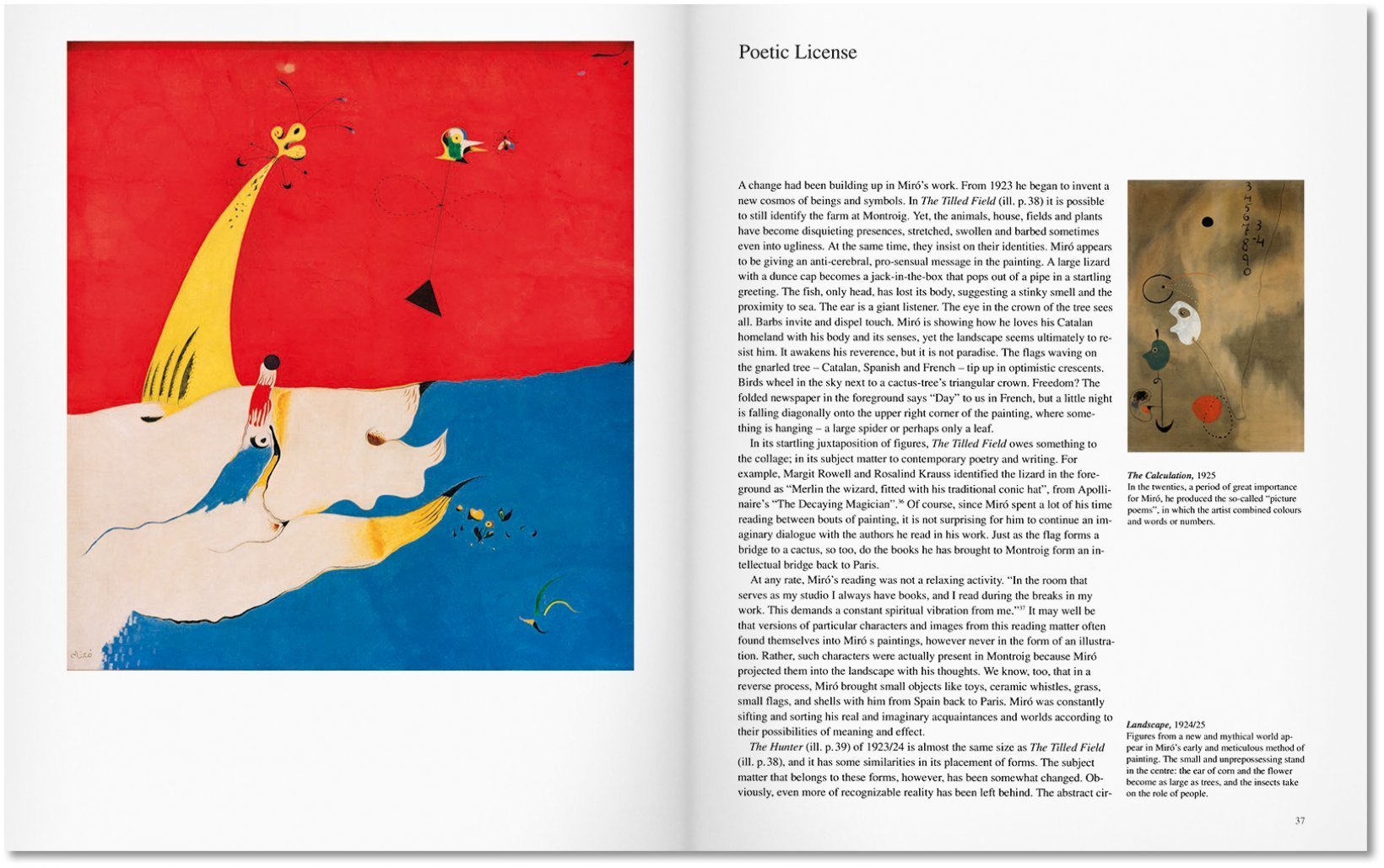 Von Mitte der 1920er-Jahre an, war Miró bestrebt, jeglichen direkten Bezug auf Gegenständliches hinter sich zu lassen und entwickelte die Piktogramme, die für seinen Stil typisch sind. Die Bilder aus dieser Periode, darunter die vielleicht schönsten und bedeutendsten seines gesamten Werks, verzichten auf jegliche Räumlichkeit und unzweideutige Verweise auf Gegenständliches. Seither waren Mirós Bilder von Ziffern, Schriftelementen, abstrakten Emblemen und spielerisch wirkenden Figuren und Kreaturen bevölkert.